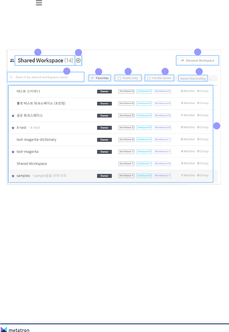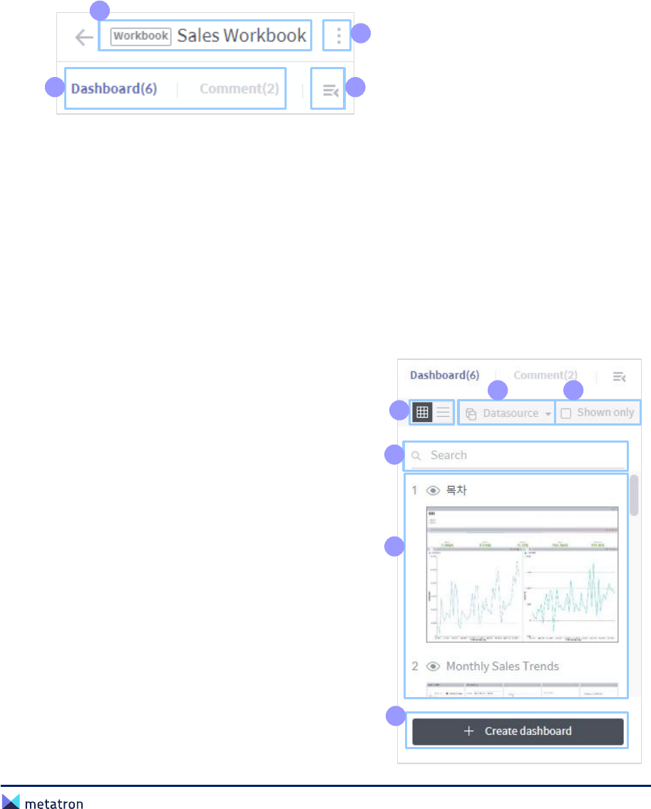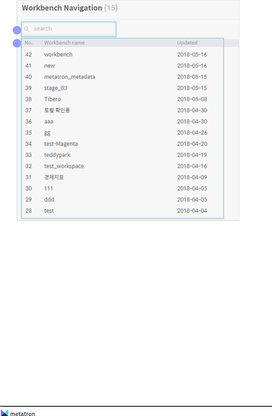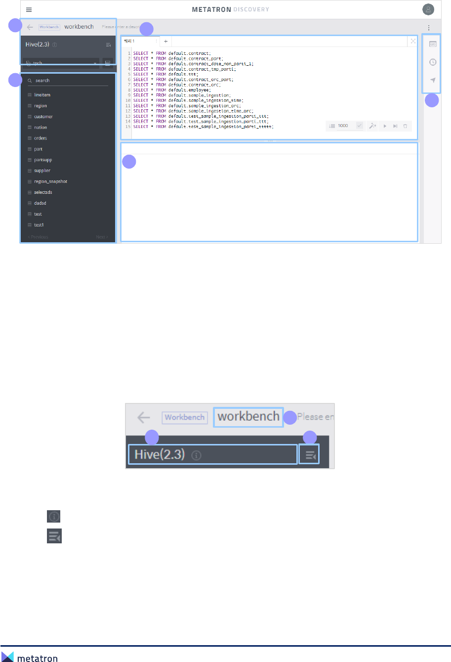 ❷ Workbench list: Display all workbenches saved in the workspace. Click a workbench in