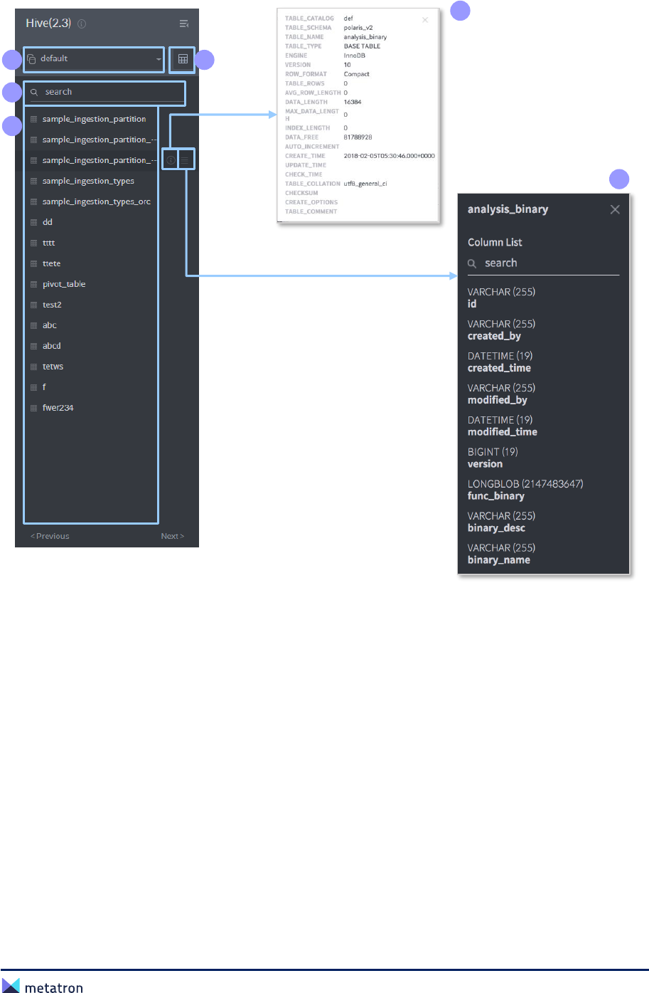 ❹ search: Search tables registered in the selected database by their name.
