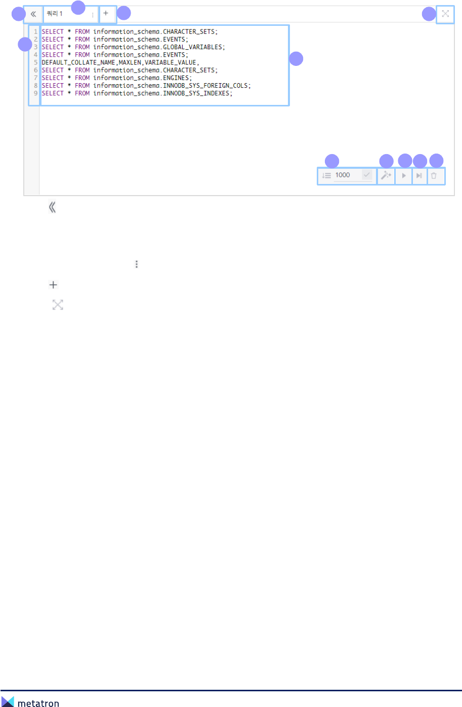 ❹ : Click this button to minimize or maximize the query editor area to full screen.