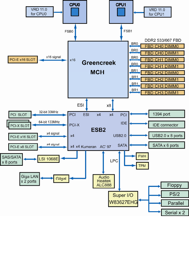 5000X (Greencreek) MCH and ESB2 chipsets.