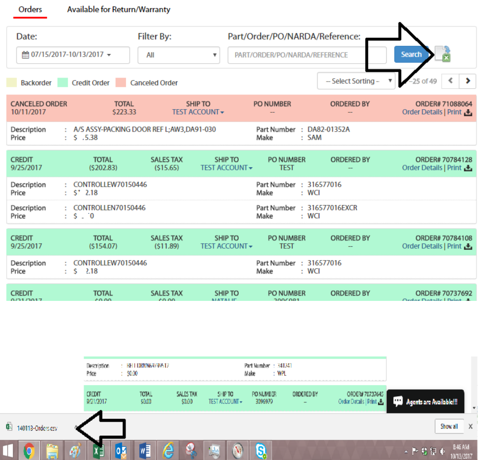 From the orders screen, click on a date range to export. Hit search. Now, click on the export button to