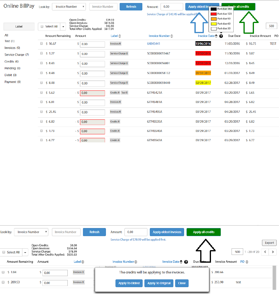 apply to the oldest invoices. The green button will automatically apply credits to your account. Past due