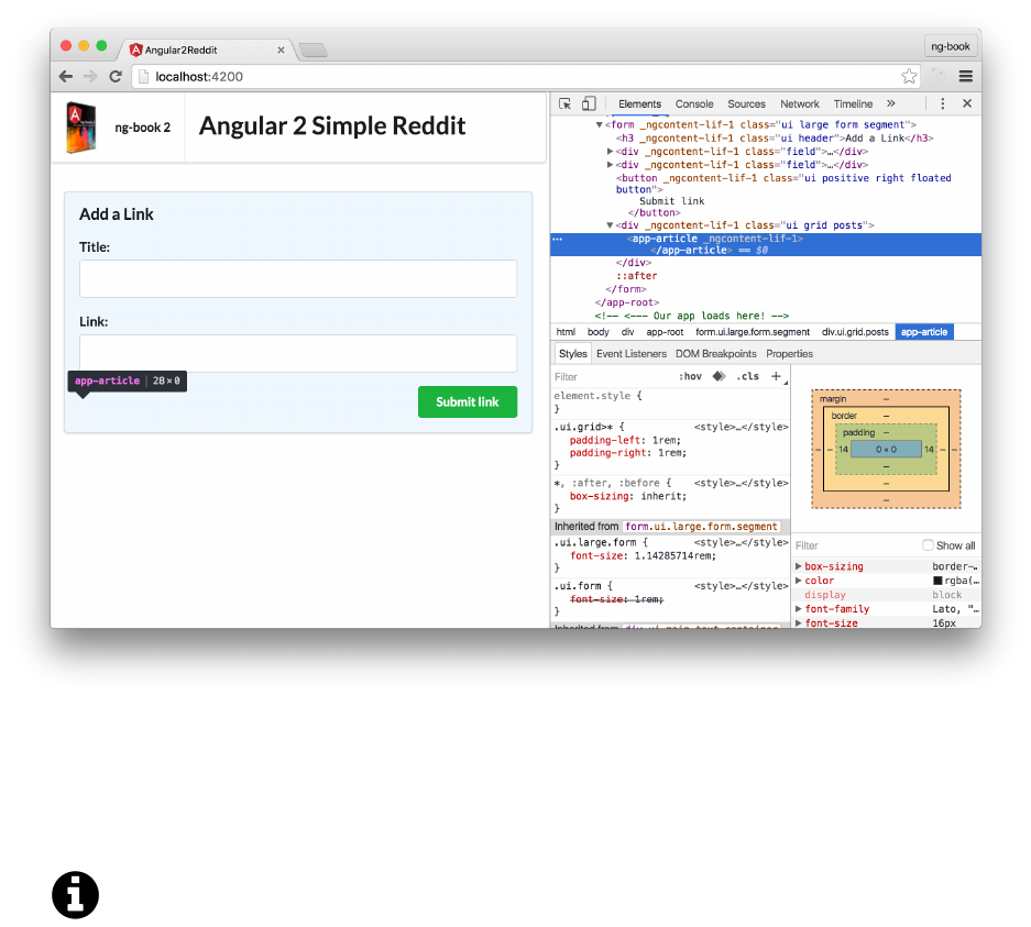 • Fixed an issue in the First App chapter that said #newtitle bound to the value of the input (it’s