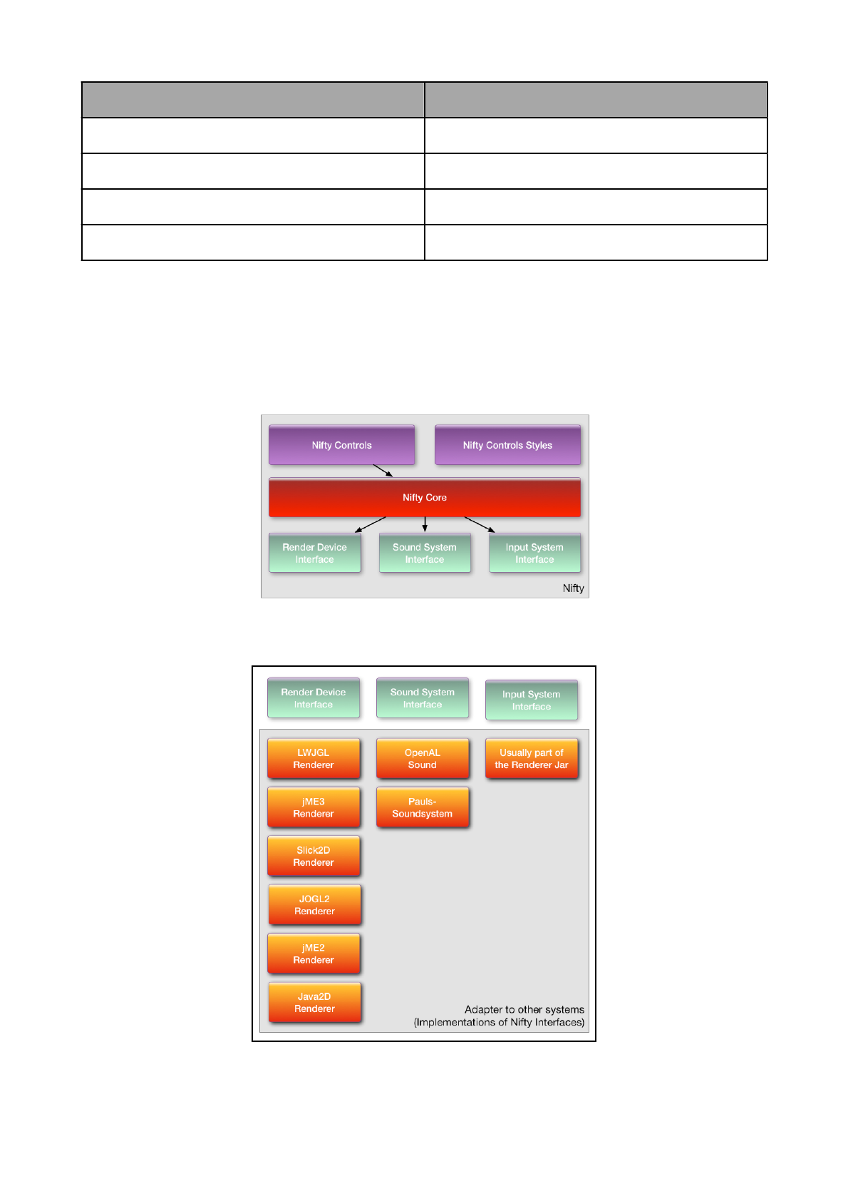 of Slick2D. Each class or interface is implemented twice. One overlay type and one pure Nifty GUI