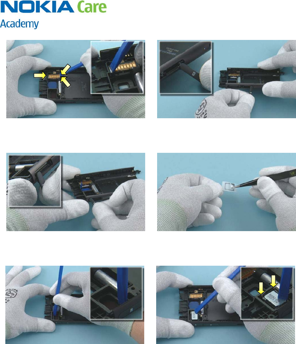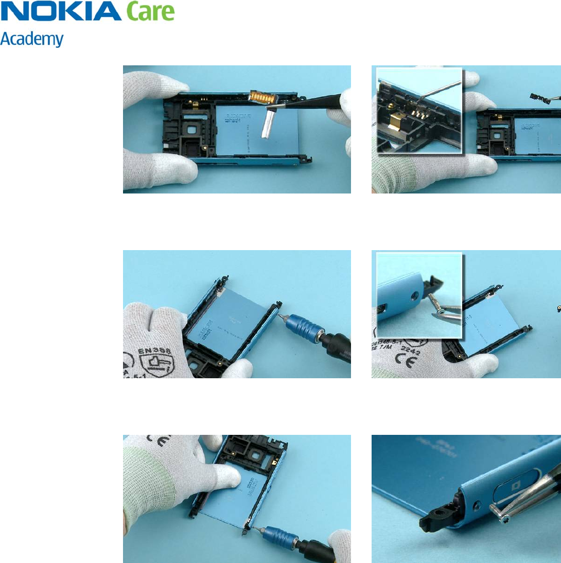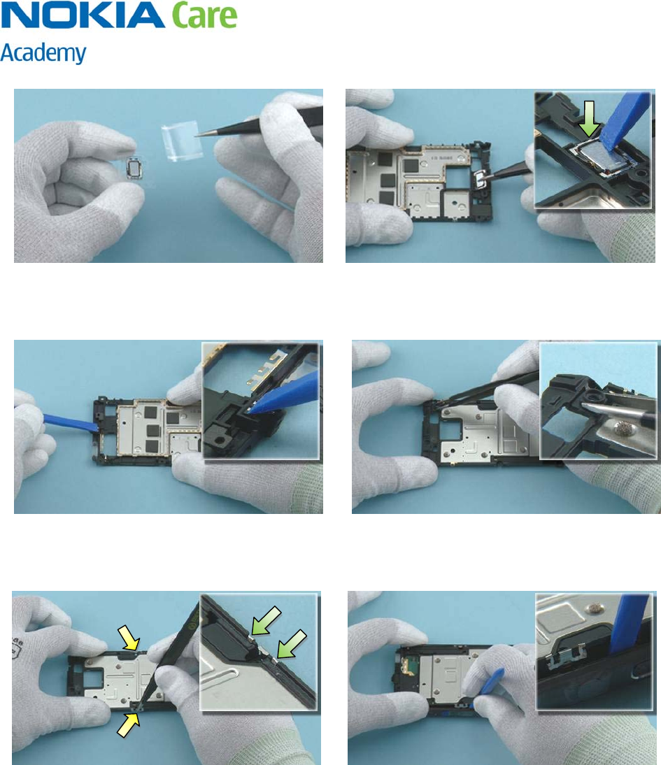 23) Remove the EARPIECE ADHESIVE protective film. 24) Use the tweezers to place the EARPIECE
