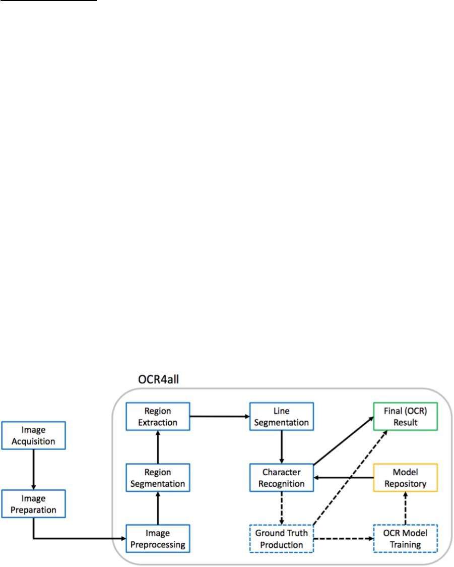 Fig. 1 shows the main steps of the workflow implemented in OCR4all. After acquiring the scans