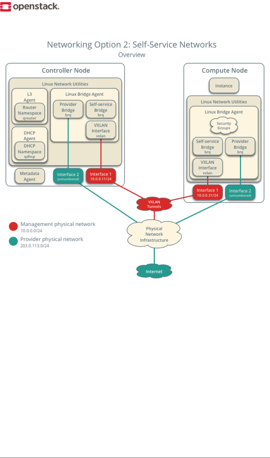 • Overlay (tunnel) traffic for self-service networks traverses the management network instead of a dedi-