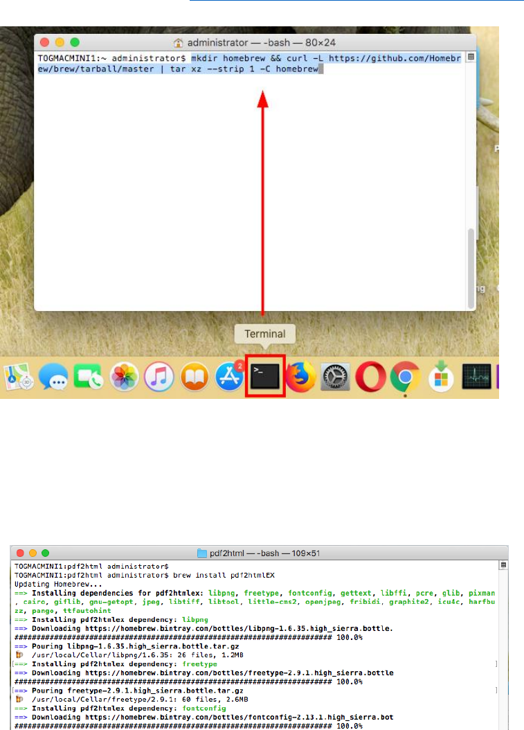 7. Open “Terminal” and go to “pdf2htmlEX” folder and then use command pdf2htmlEX path/file.pdf for