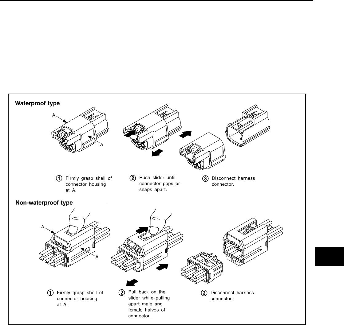 ●The slide-locking type connectors are disconnected by pushing or pulling the slider. Refer to the illustra-