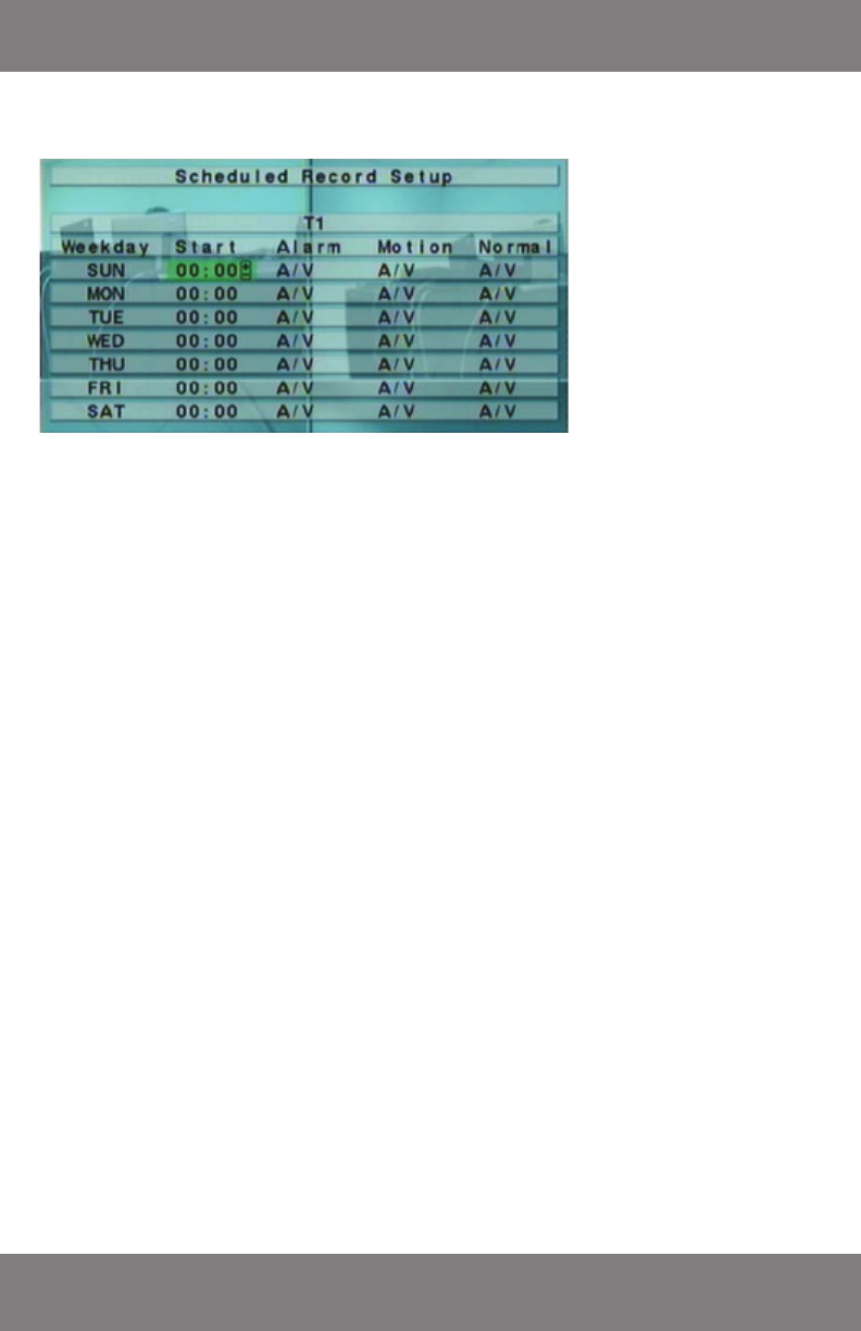 to 16 time segments (T1 – T16) for each weekday. Each time segment will allow you to set up recording settings for