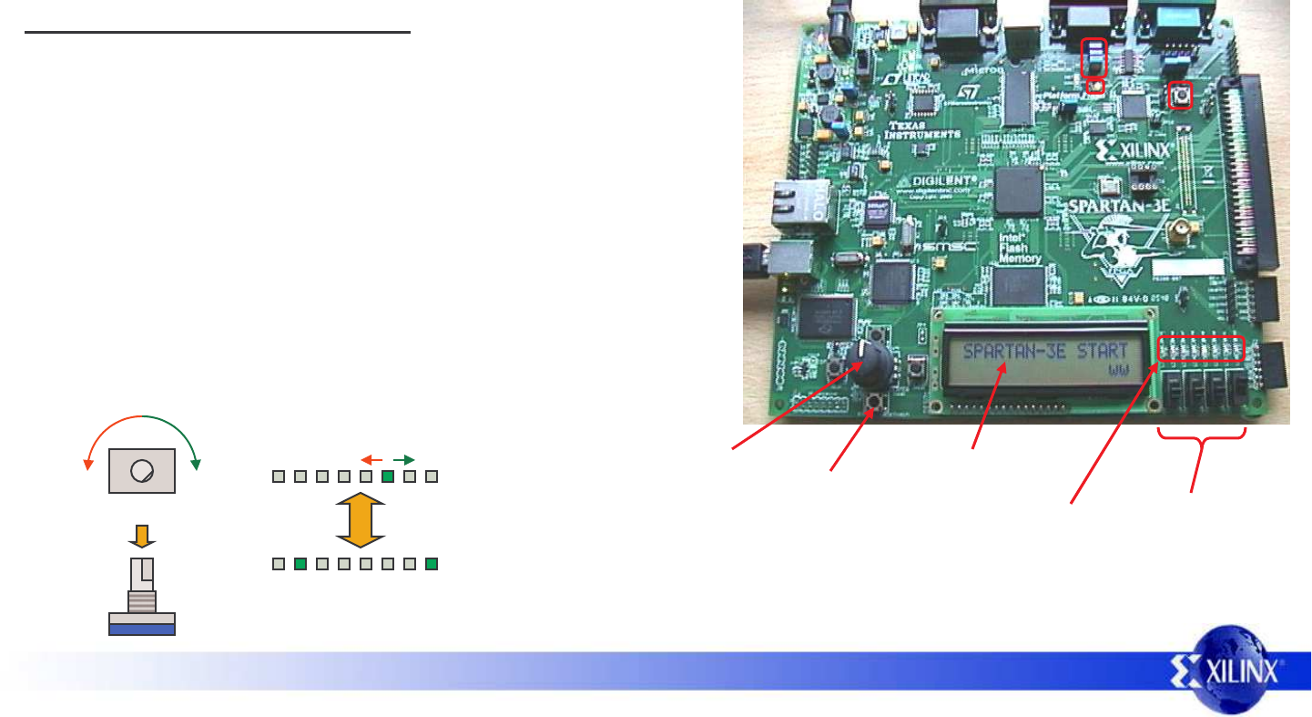 This design is provided on the Spartan-3E Starter Kit when it is dispatched from the factory. It confirms that the board is operational by scrolling a simple