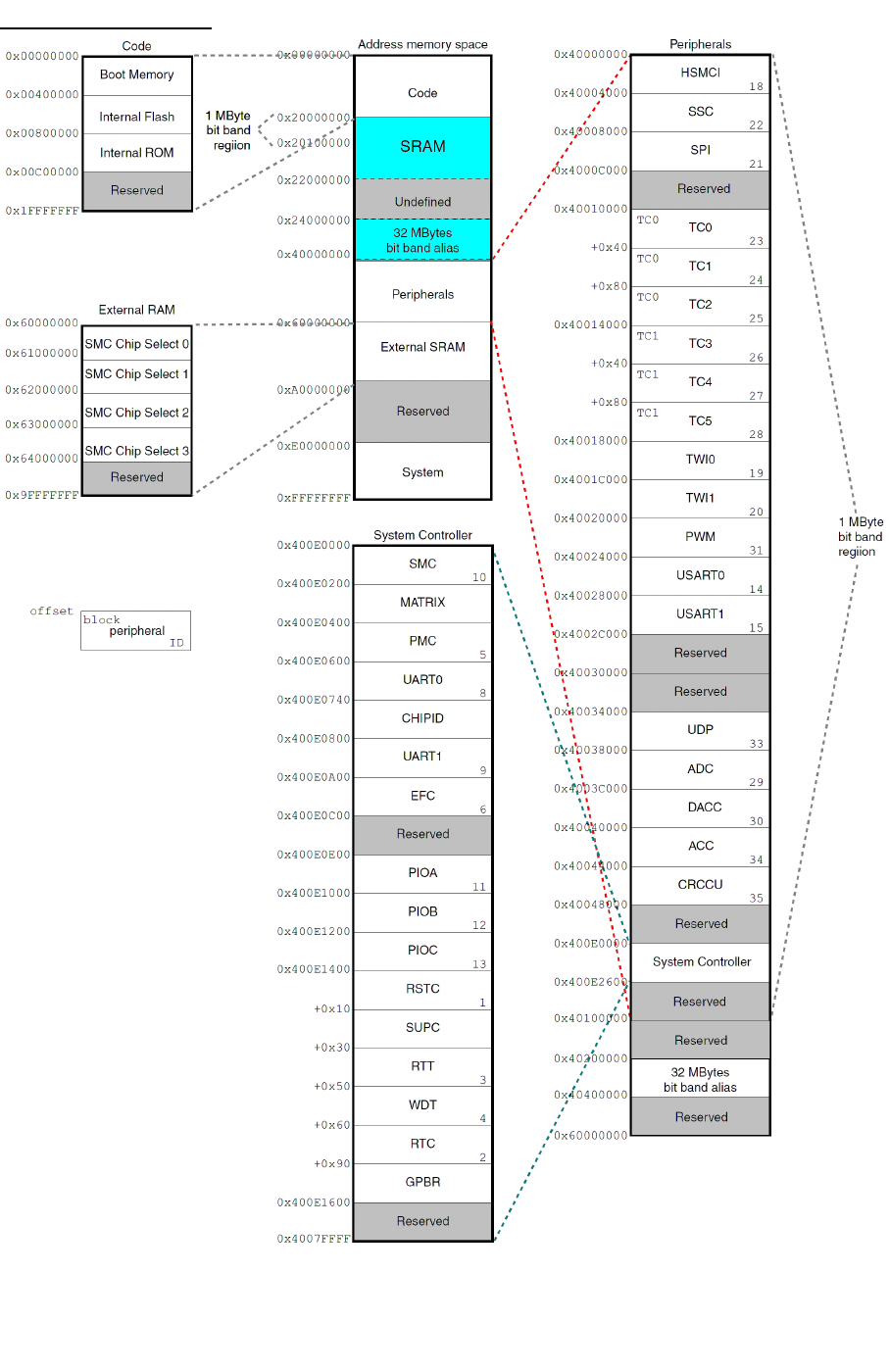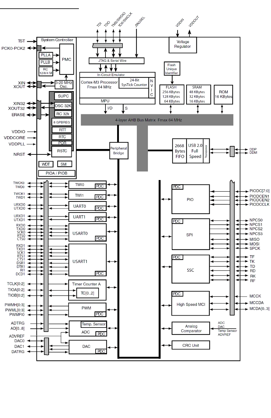 PSRAM, NOR Flash and NAND Flash, 2x USARTs, 2x UARTs, 2x TWIs, 3x SPI, an