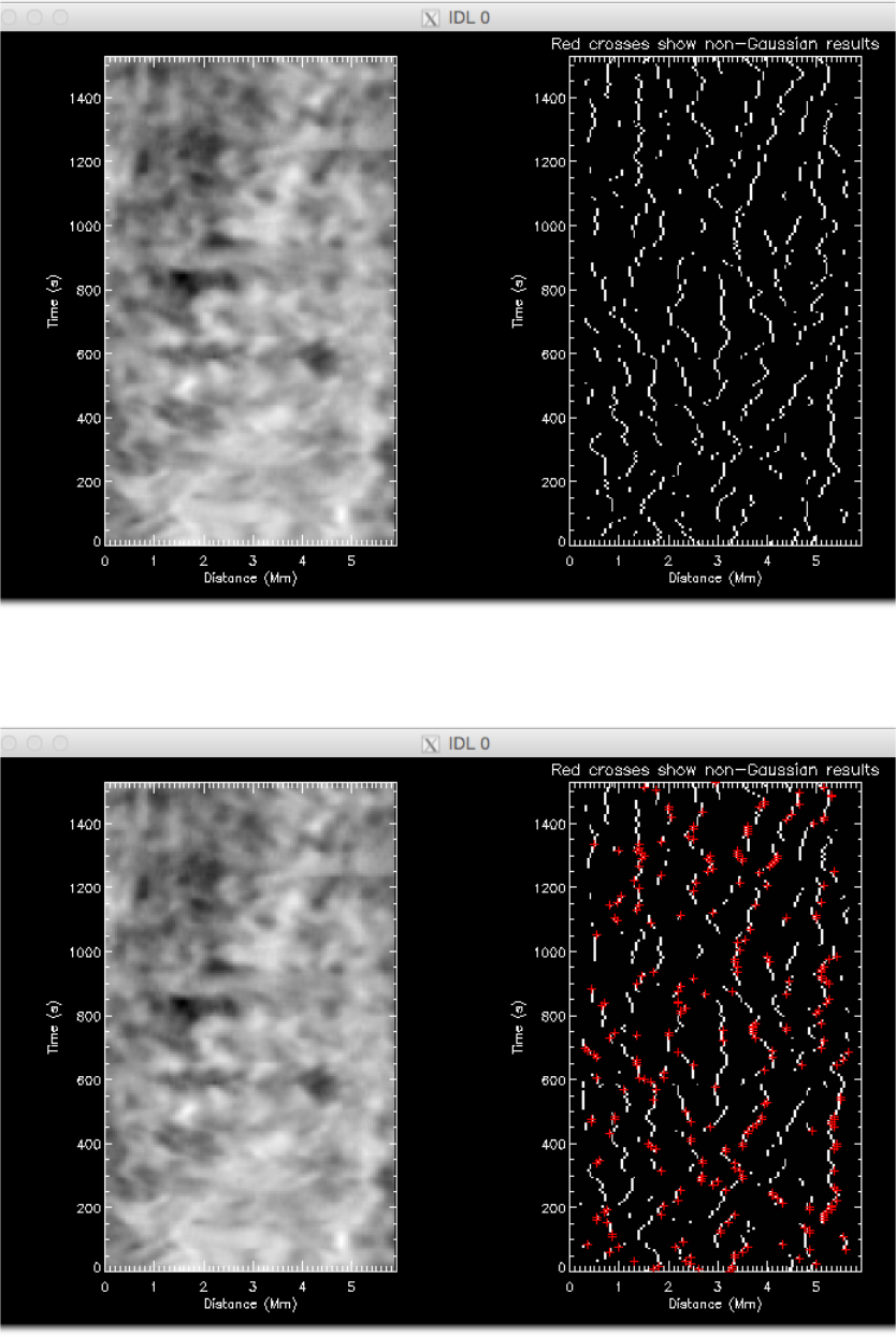 Figure 5: Peak finding. The left hand panel shows the intensity time-distance diagram. The right hand panel shows the