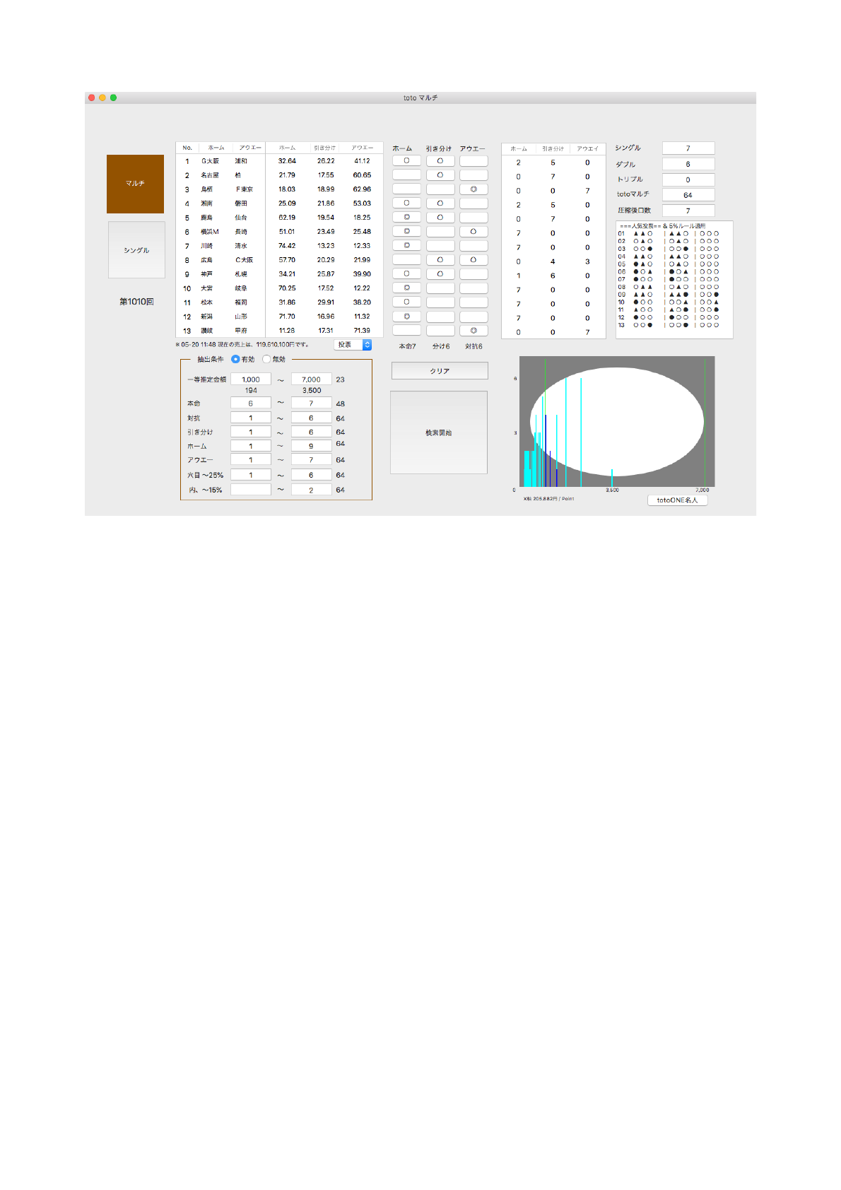 金額y軸は件数です。右上の表は、集計表です。右下のtotoONE名人ボタンはトトワングランプ