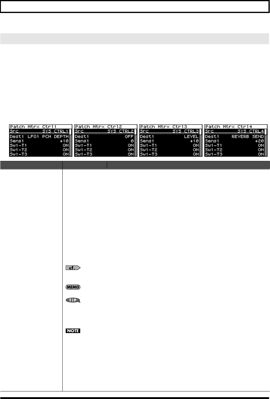 - Settings for matrix control (Patch Mtrx Ctrl1–4 screens)
