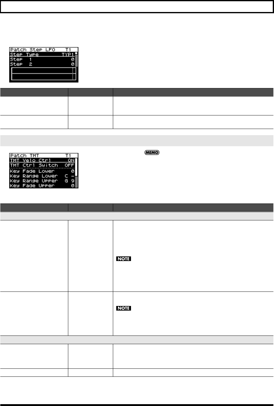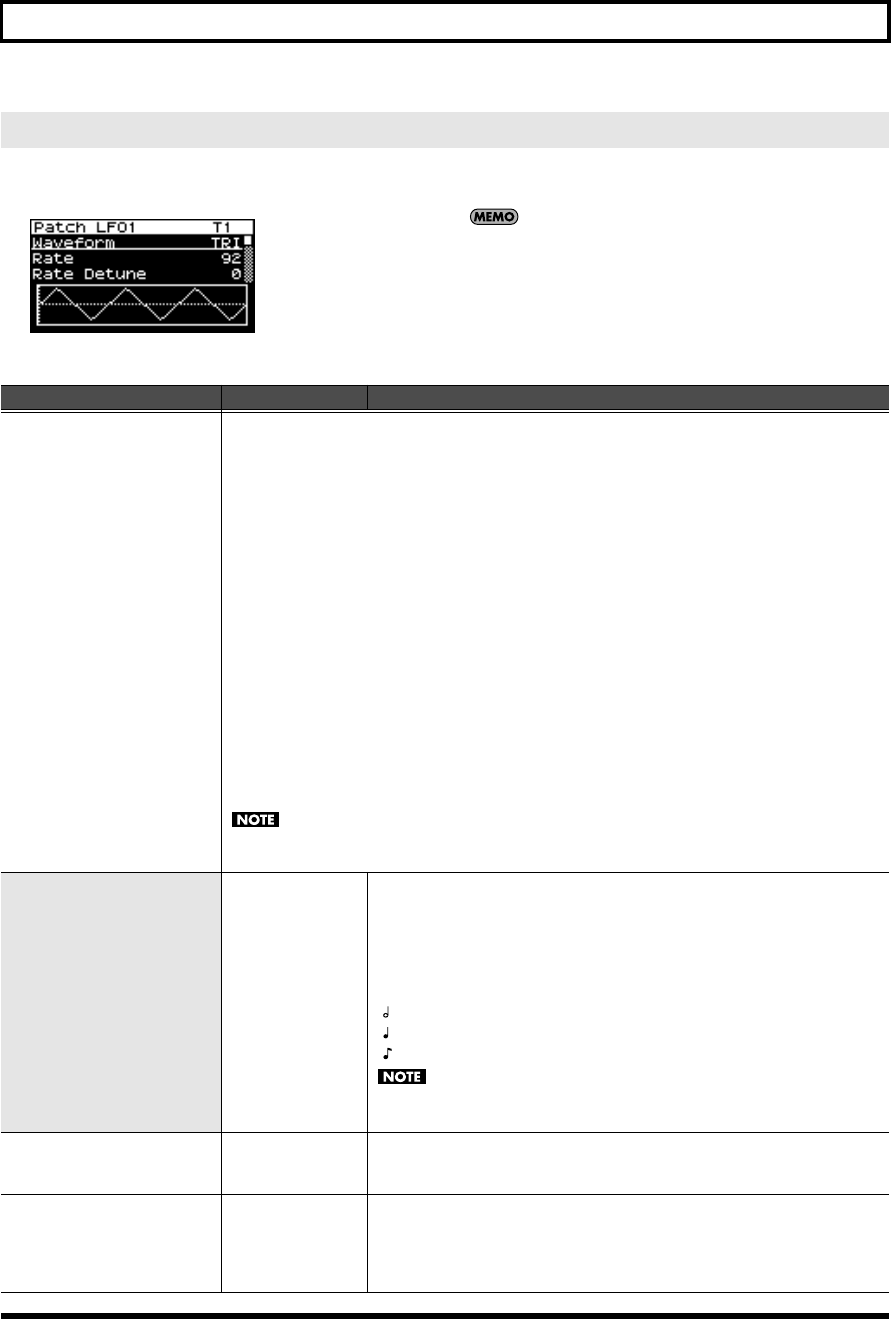 - LFO settings (Patch LFO1, 2/Patch Step LFO screen)