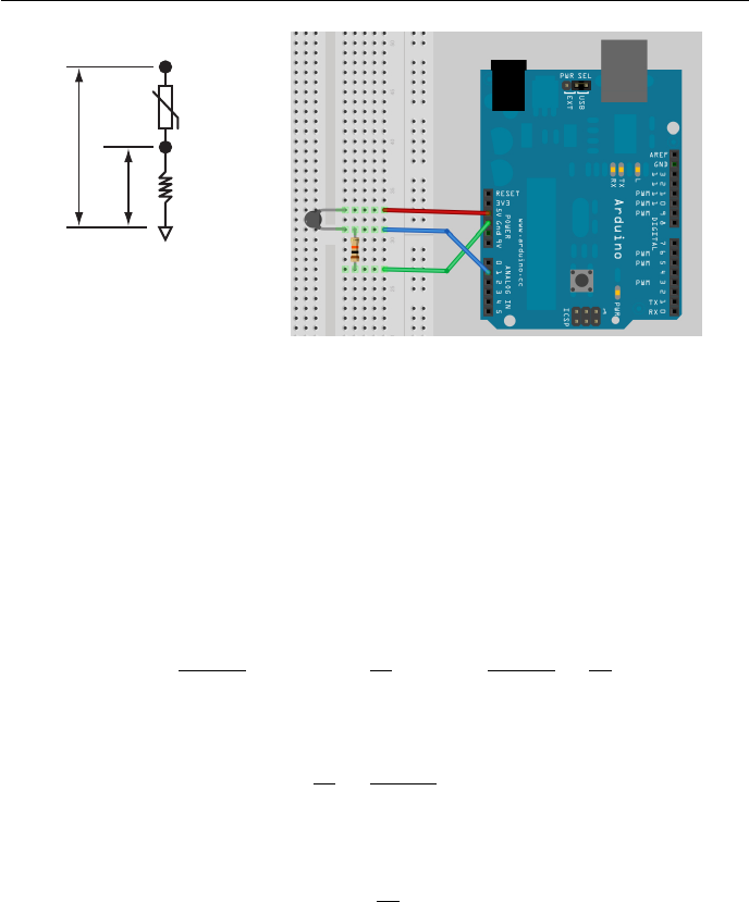 measuring voltage to indicate thermistor resistance. For the breadboard wiring