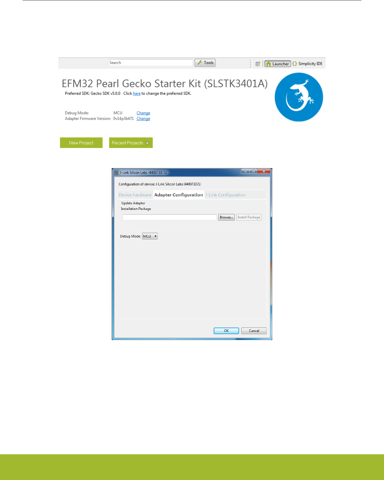 The kit configuration dialog in Simplicity Studio allows you to change the J-Link adapter debug mode, upgrade its firmware and change