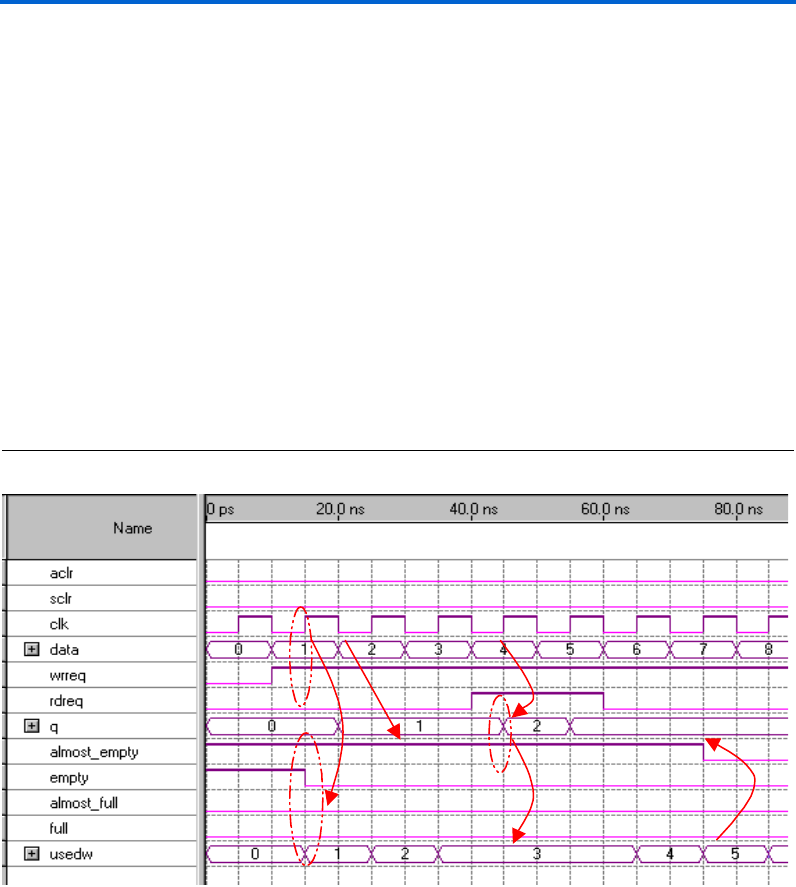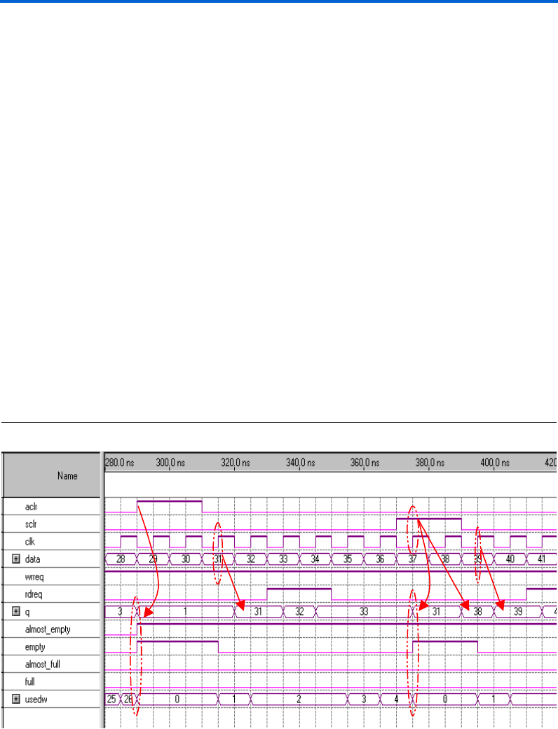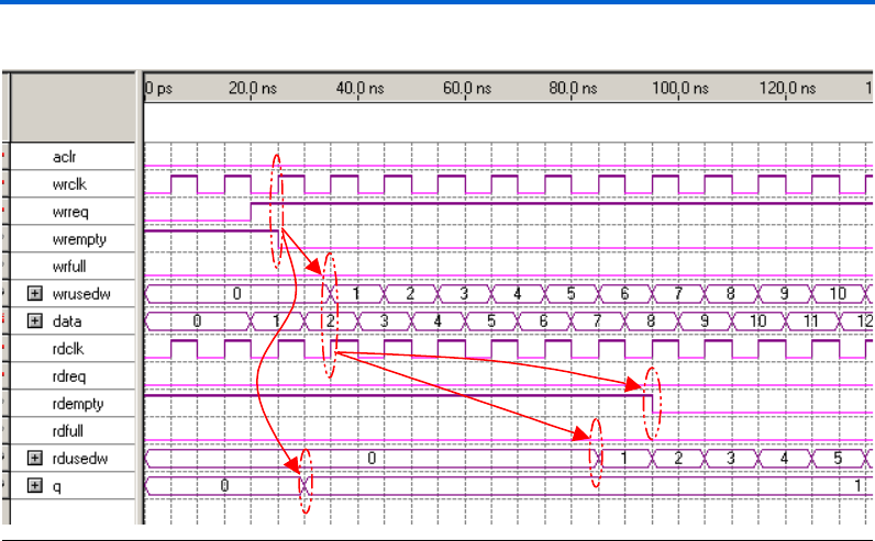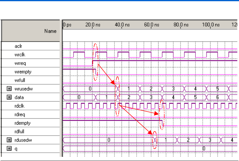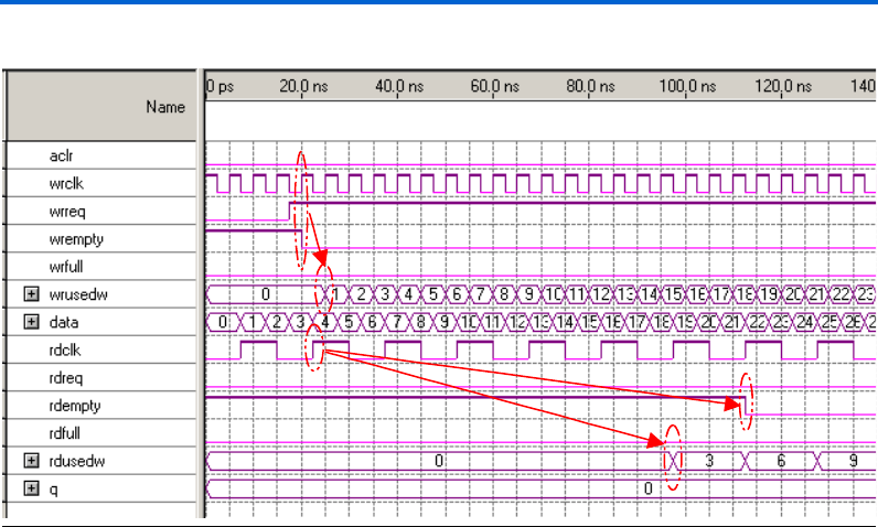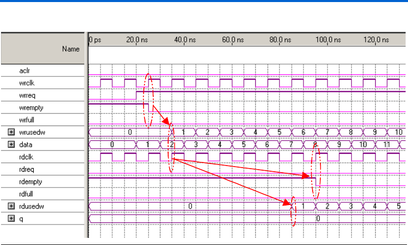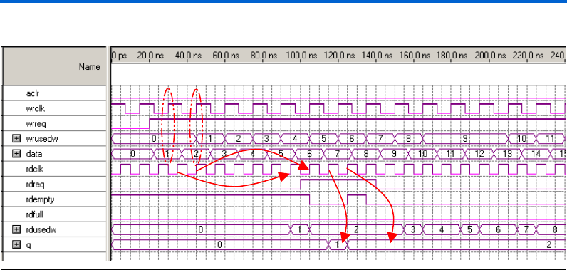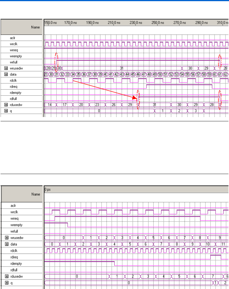 deasserted six rdclk cycles after the first wrreq. The rdempty port