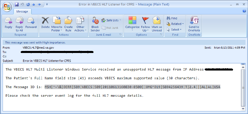 - VBECS responds to the new order request with an application reject (AR) acknowledgement message indicating Patient Name(s) not found in HL7 Message or Patient's Name(s) field size(s) exceed(s) VBECS maximum supported value. Rejected patient order messages due to invalid patient name message content are recorded on the Windows Event Log (Finding Application Log Entries from Email Alerts) and an email message containing the MSH segment of the rejected HL7 message.