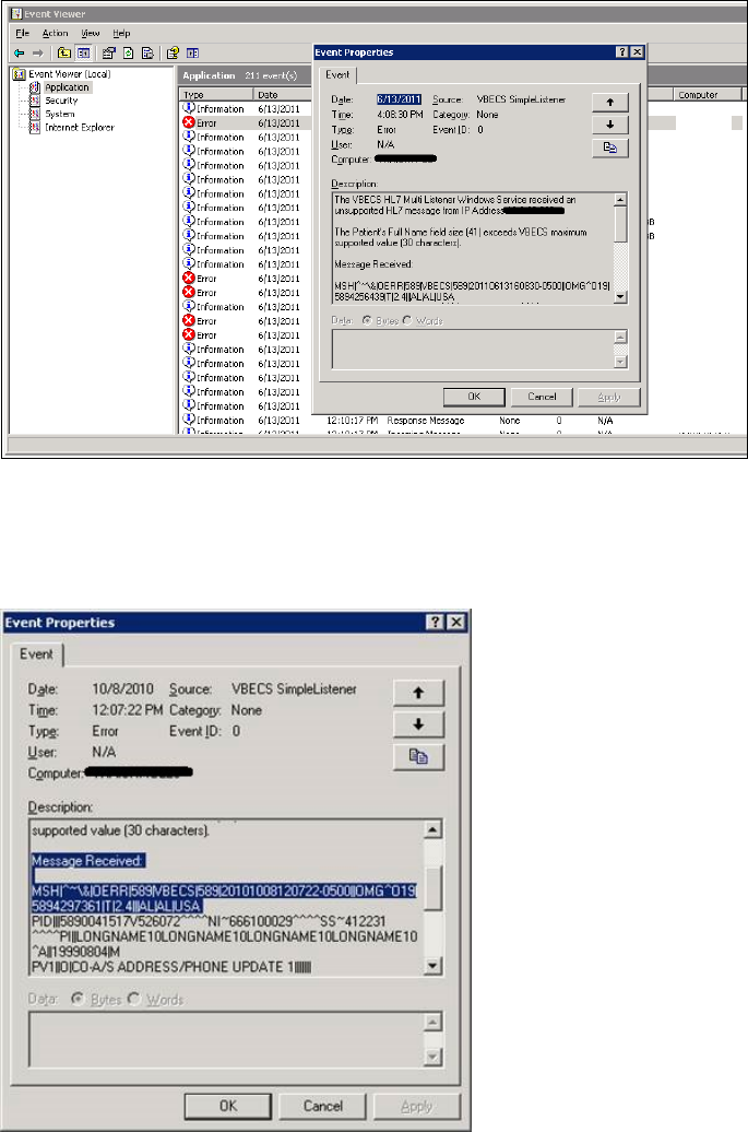 - VBECS responds to the patient update request with an application reject (AR) acknowledgement message indicating Patient Name(s) not found in HL7 Message or Patient's Name(s) field size(s) exceed(s) VBECS maximum supported value. Rejected patient update messages due to invalid patient name message content are recorded on the Windows Event Log (Finding Application Log Entries from Email Alerts)