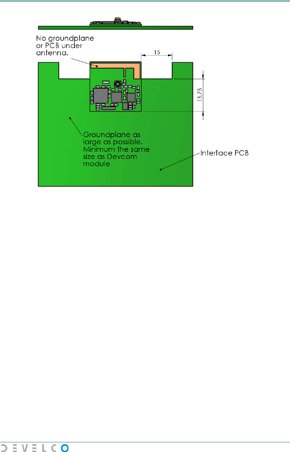 The antenna implemented on the DevCom 06 ZigBee Module is an in-PCB F-antenna. The F-antenna