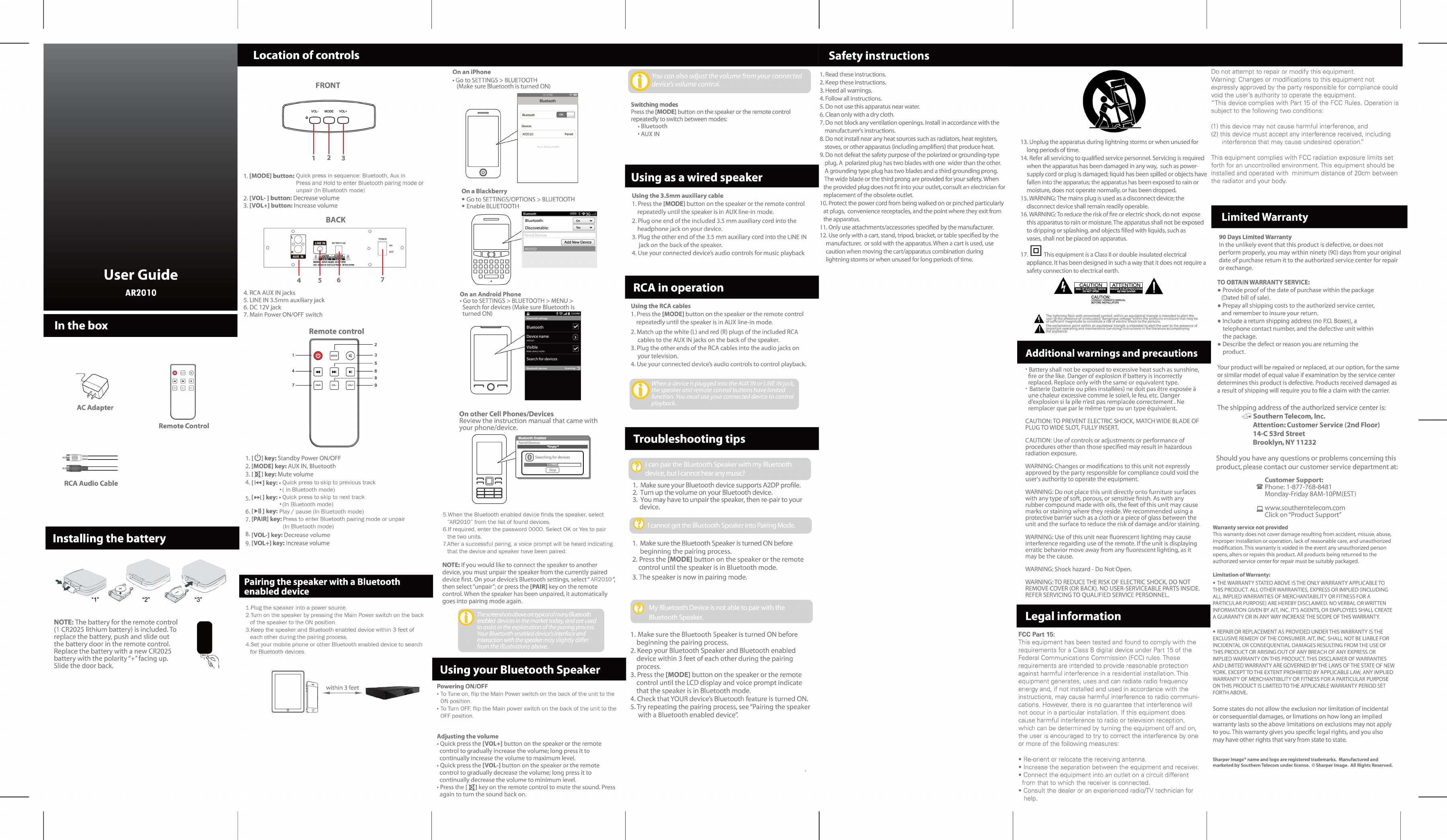 Dongguan Earson Audio Technology AR2010 BT SOUND BAR User Manual