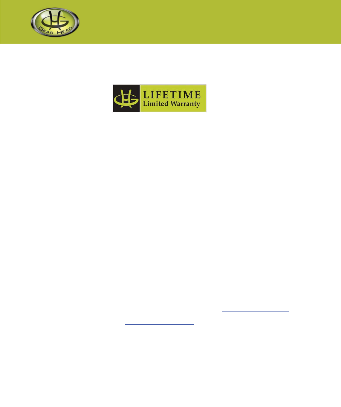 Gear Head, LLC warrants that this product shall be free from defects in materials and workmanship for the