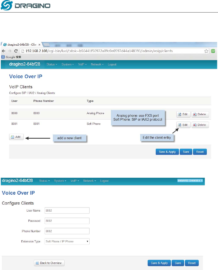 User can add clients via the VoIP Æ Clients page. VoIP client uses the type soft phone while