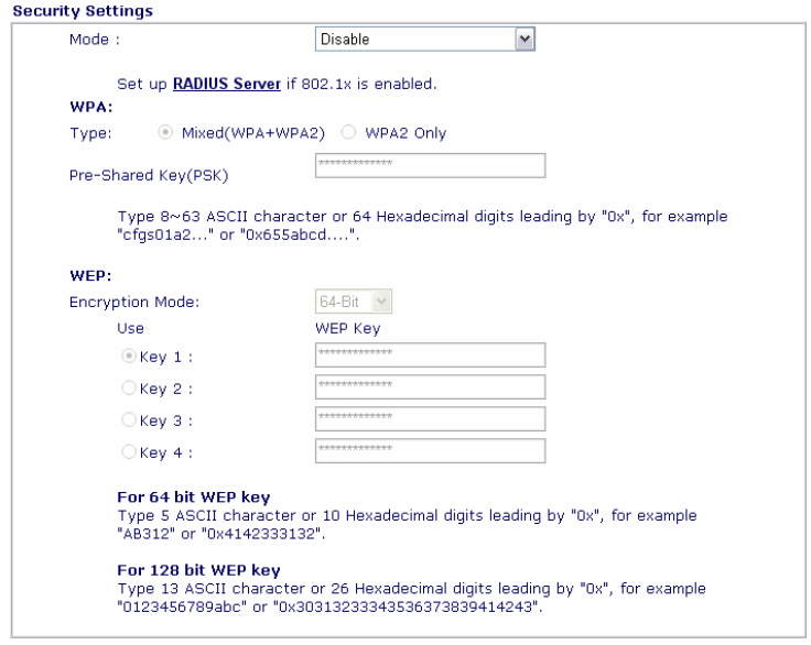 encryption bit size and have the same key. If WEP, only one key out