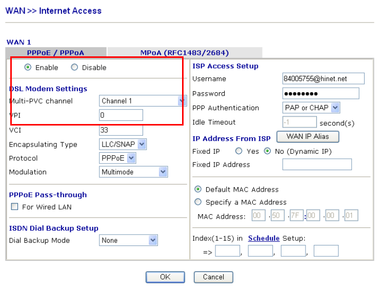 Open WAN >> Internet Access page and then check whether the ISP settings are set