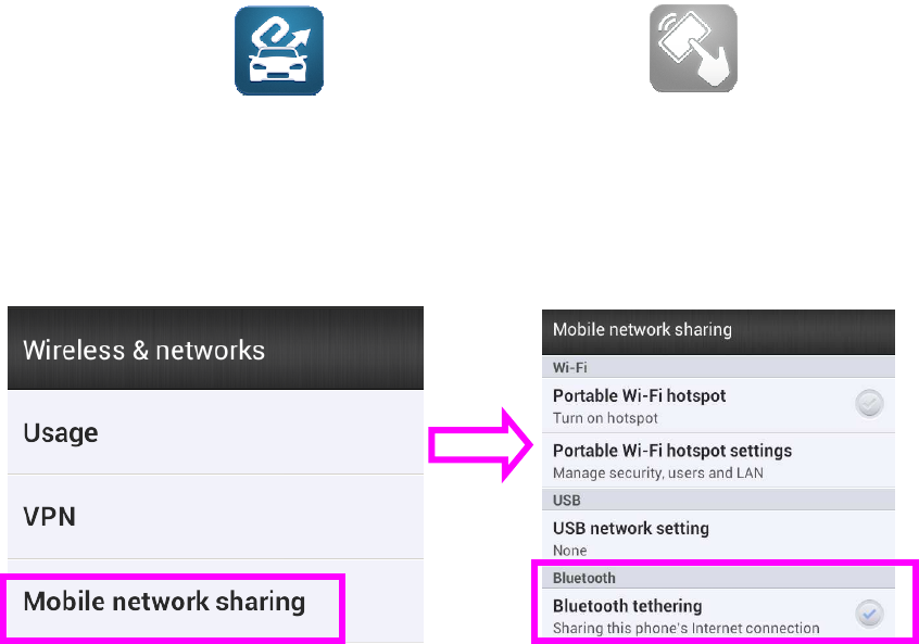 Procedure2 Open Mobile Functions:Setting > Wireless and networks > Mobil network sharing > Bluetooth