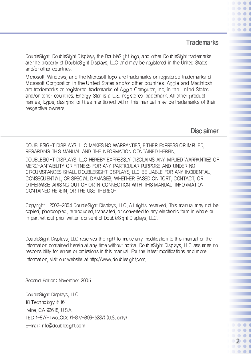 by calling 1-877-TwoLCDs (1-877-896-5237), or email DSD at support@doublesight.com.