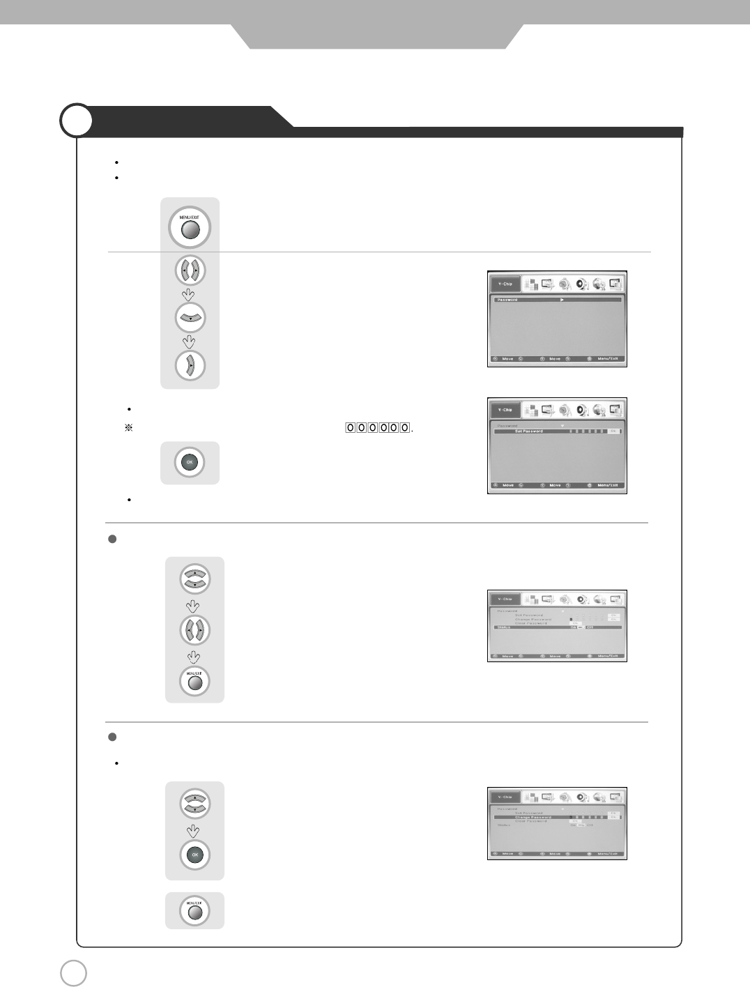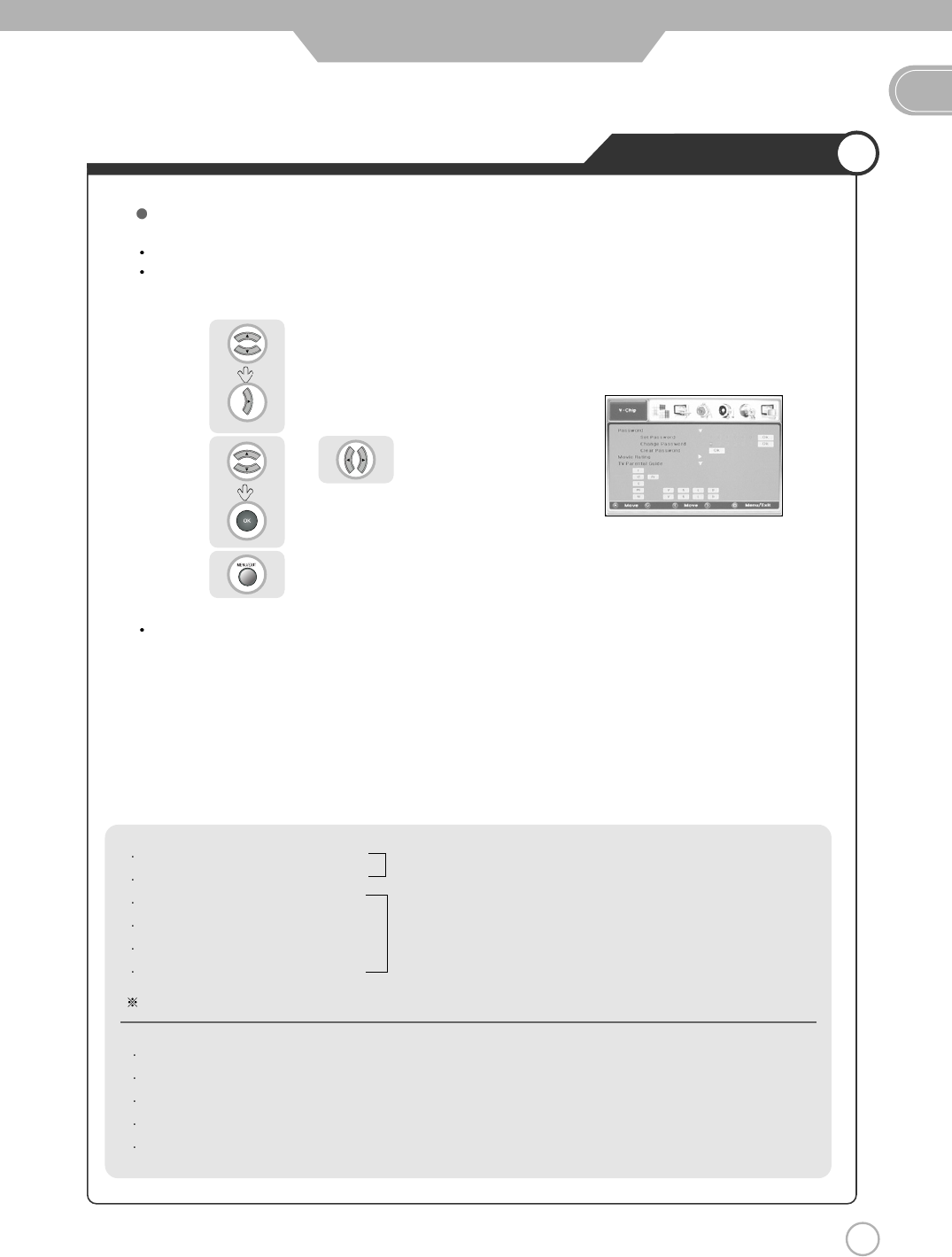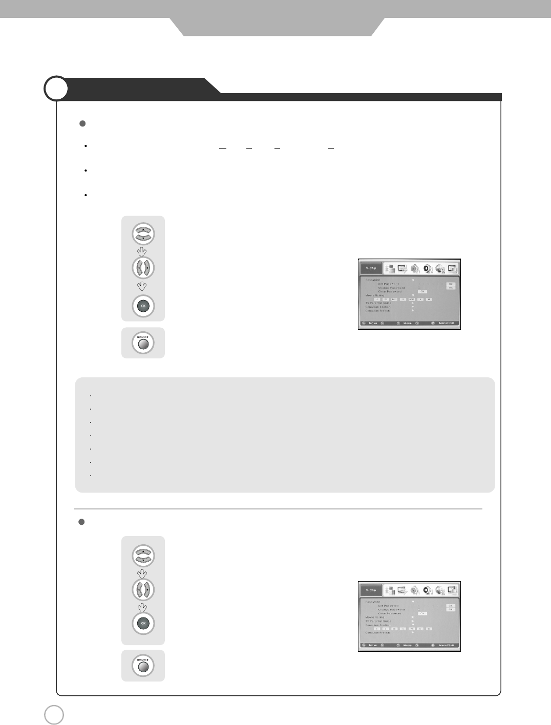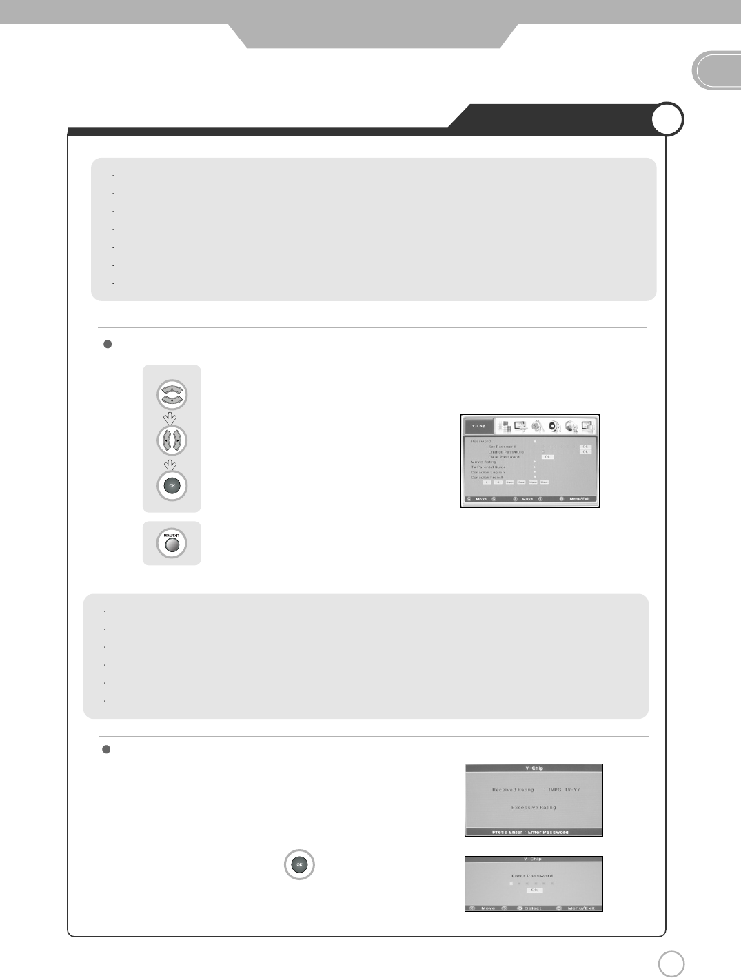 The user must first enter a password before any of the V-Chip restrictions can be set up or changed.