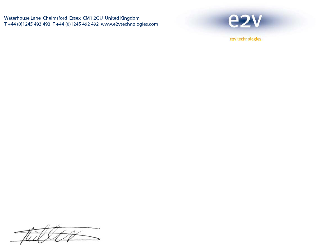 e2v technologies (uk) limited Registered in England No. 432014 Registered office: 106 Waterhouse Lane Chelmsford CM1 2QU United Kingdom UK holding company: e2v technologies plc