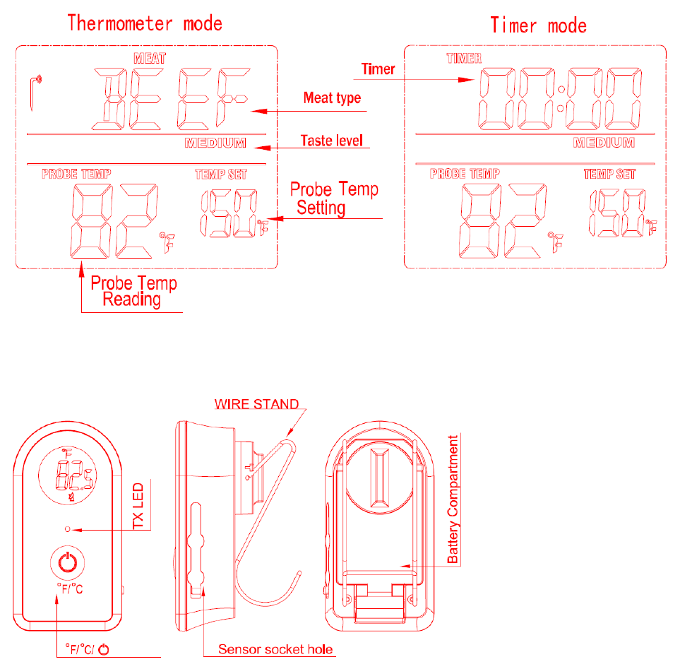 1. MODE – Press to select thermometer or timer mode. Press and hold for 2 seconds to enter
