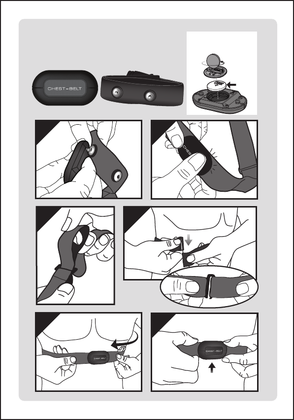 1. 依體型調整鬆緊帶並將心率傳輸器調整在您的胸口正中央,並確保心率傳輸感應區緊貼您的肌膚。