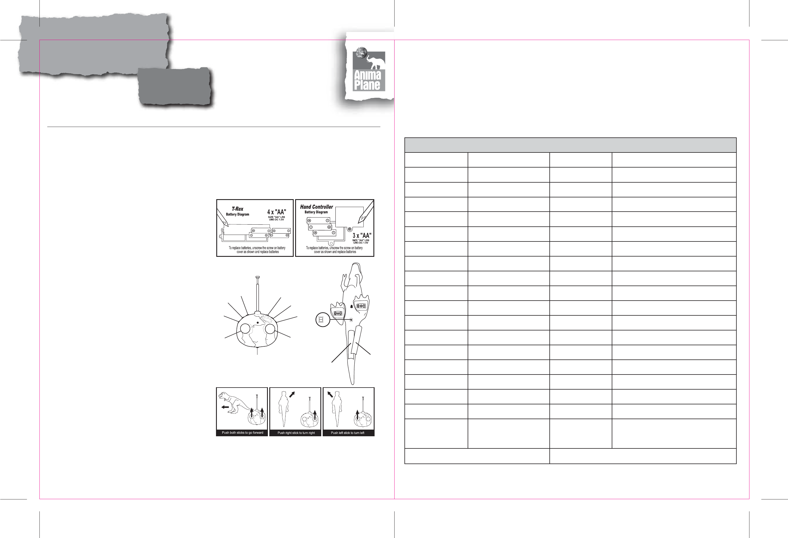 By manipulating the various function buttons on the hand controller you can control your RC T-Rex. See chart below: