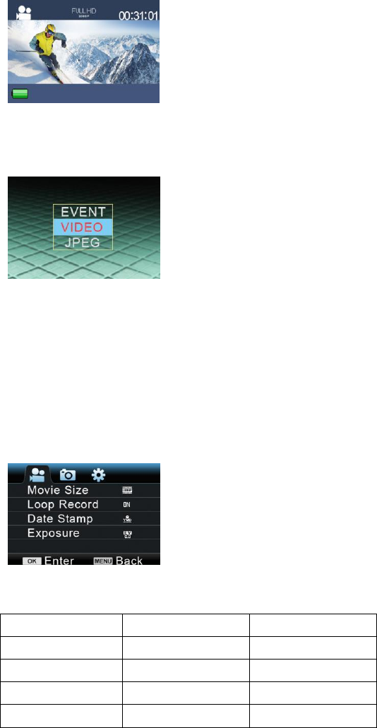 Press the Shutter/Select Button to start/stop recording. Press the Down/Shutter Button to take a