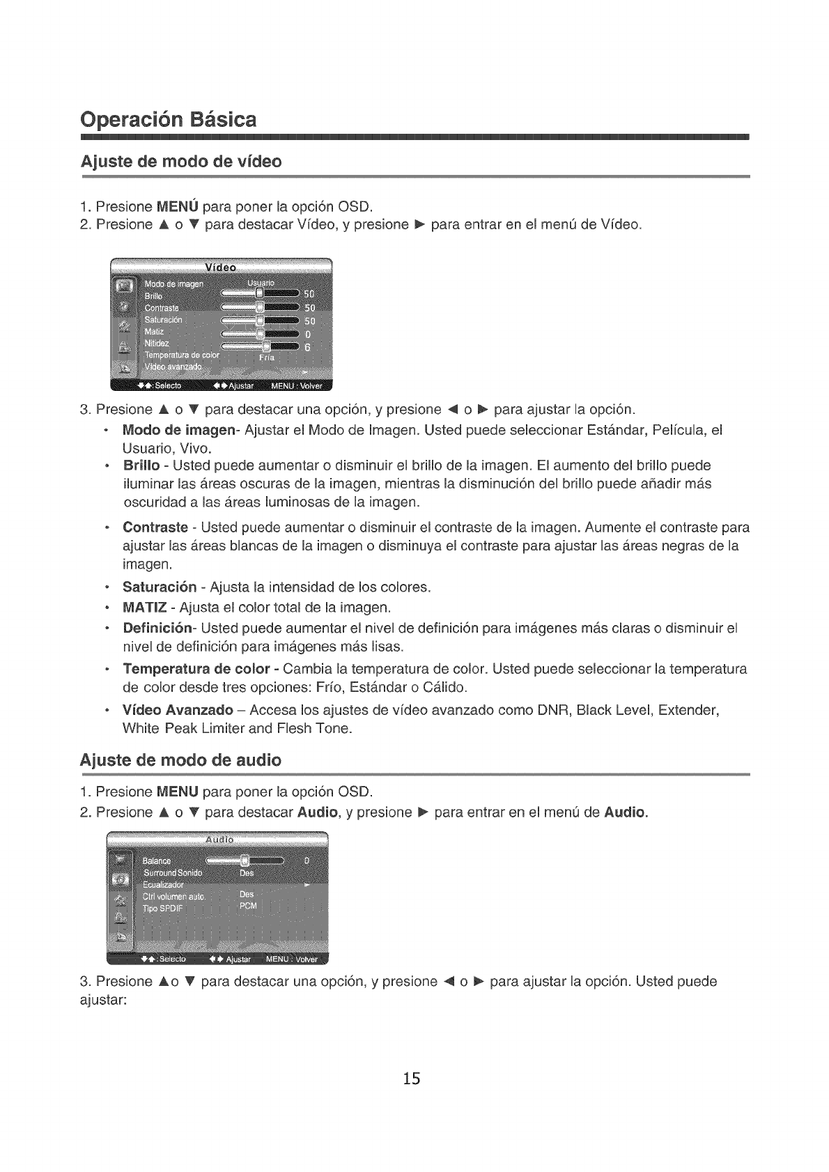 . Ajuste la Saturaci6n en ei menu de ajustes de Video.
