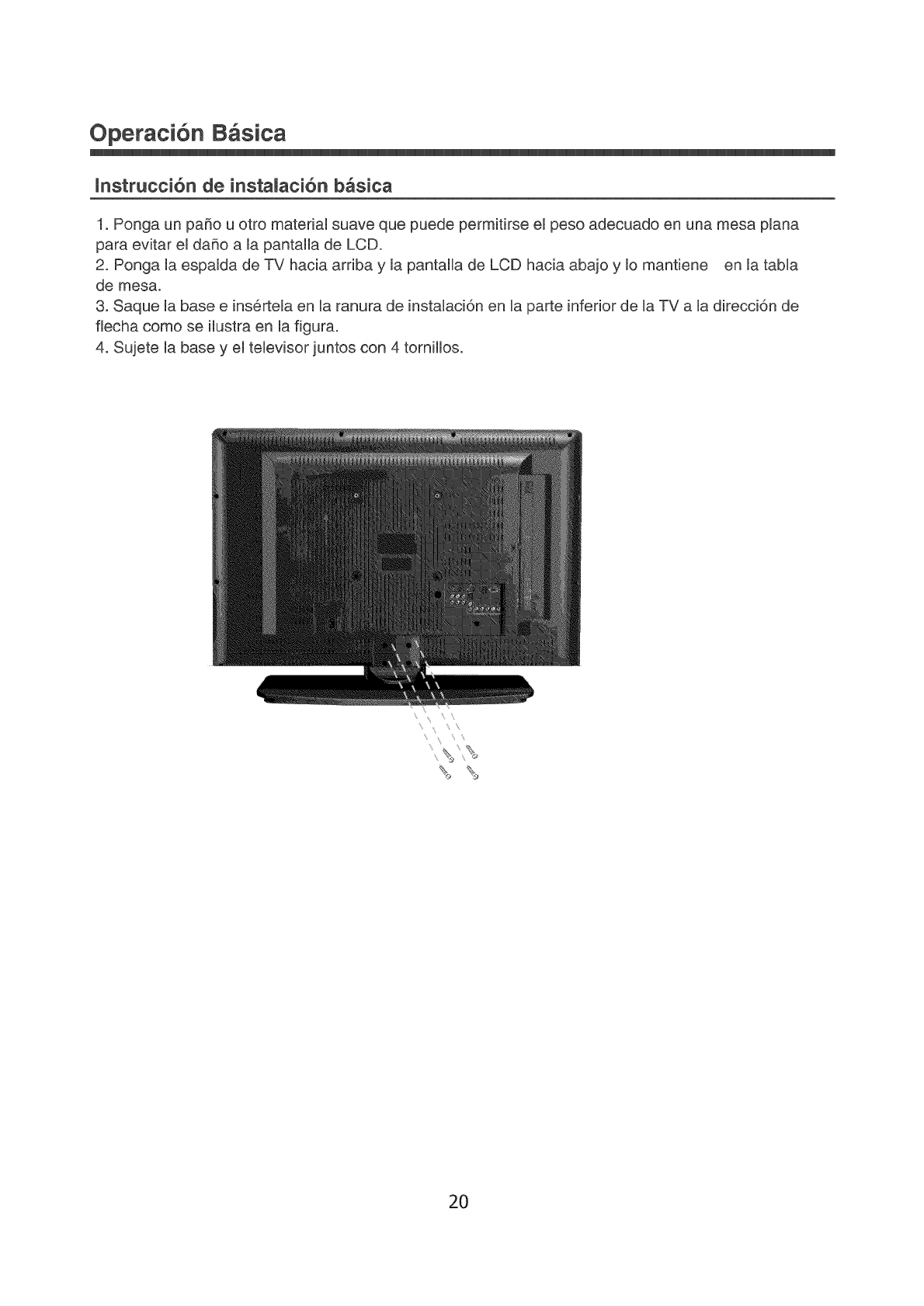 4. Su]ete la base y el televisor juntos con 4 tornillos.