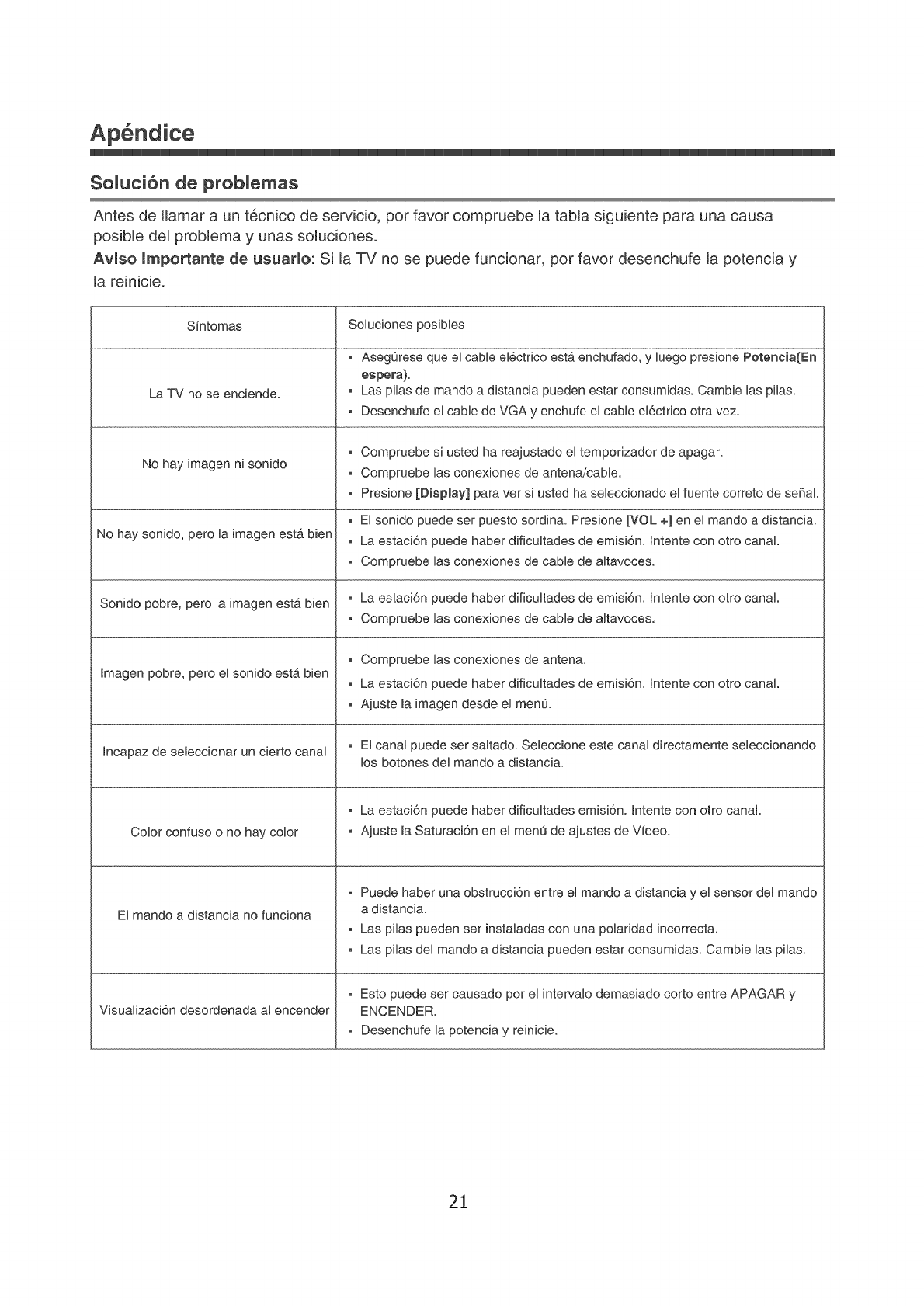 Antes de Hamar a un t6cnico de servicio, por favor compruebe la tabla siguiente para una causa