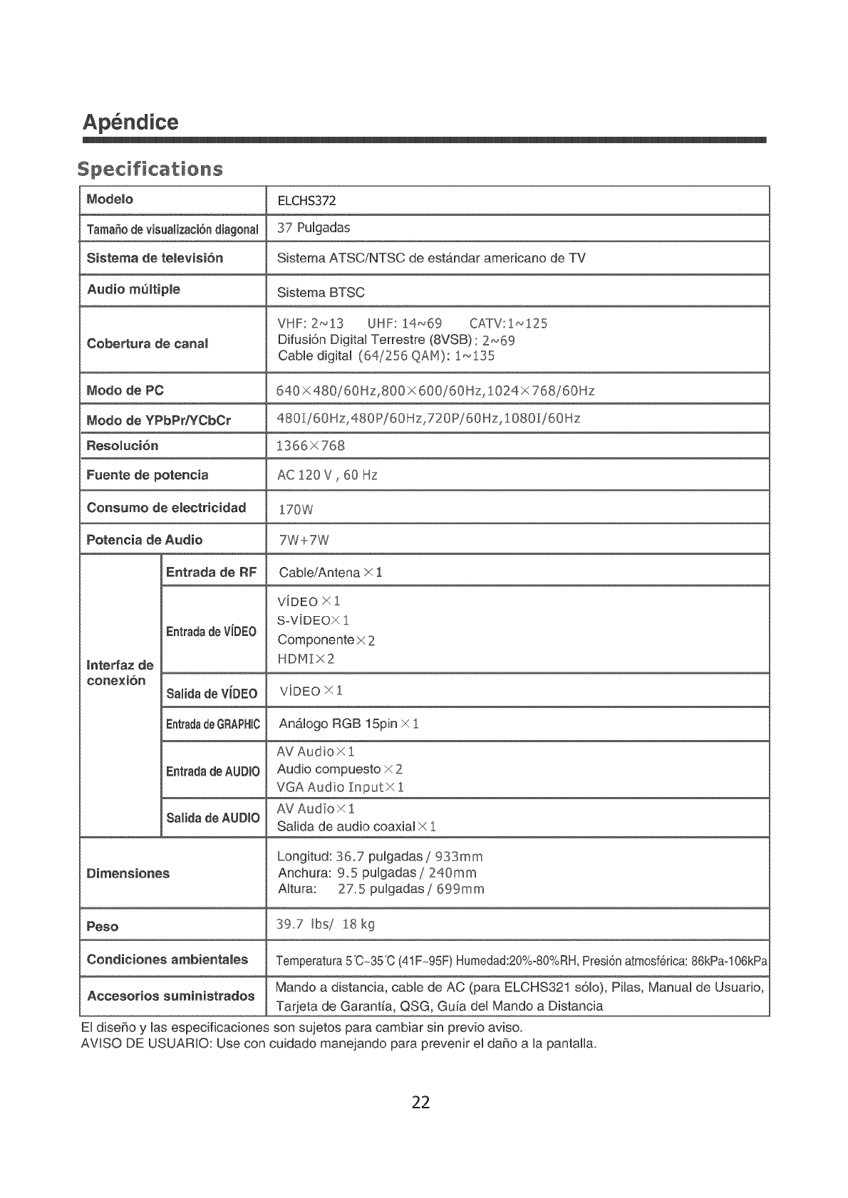 Especificaci6n ................................................................................................................................. 22
