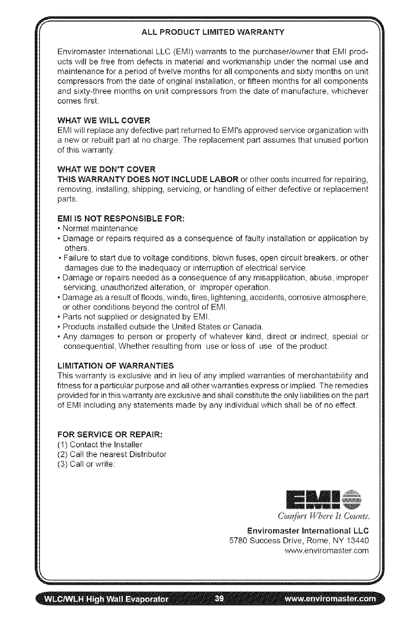 Enviromaster International LLC (EMI) warrants to the purchaser/owner that EMI prod-
