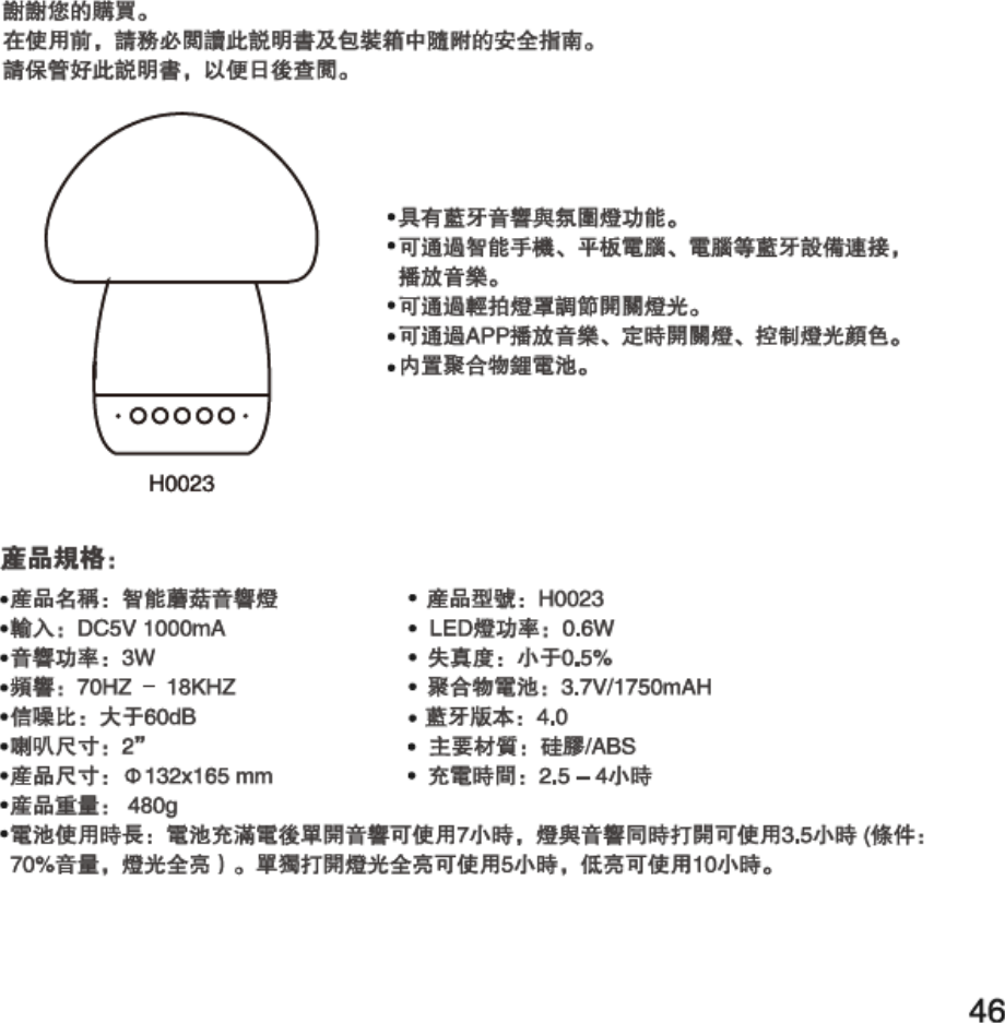 EMOI LIFESTYLE H0023 Smart Mushroom Lamp Speaker User Manual H0023 USER