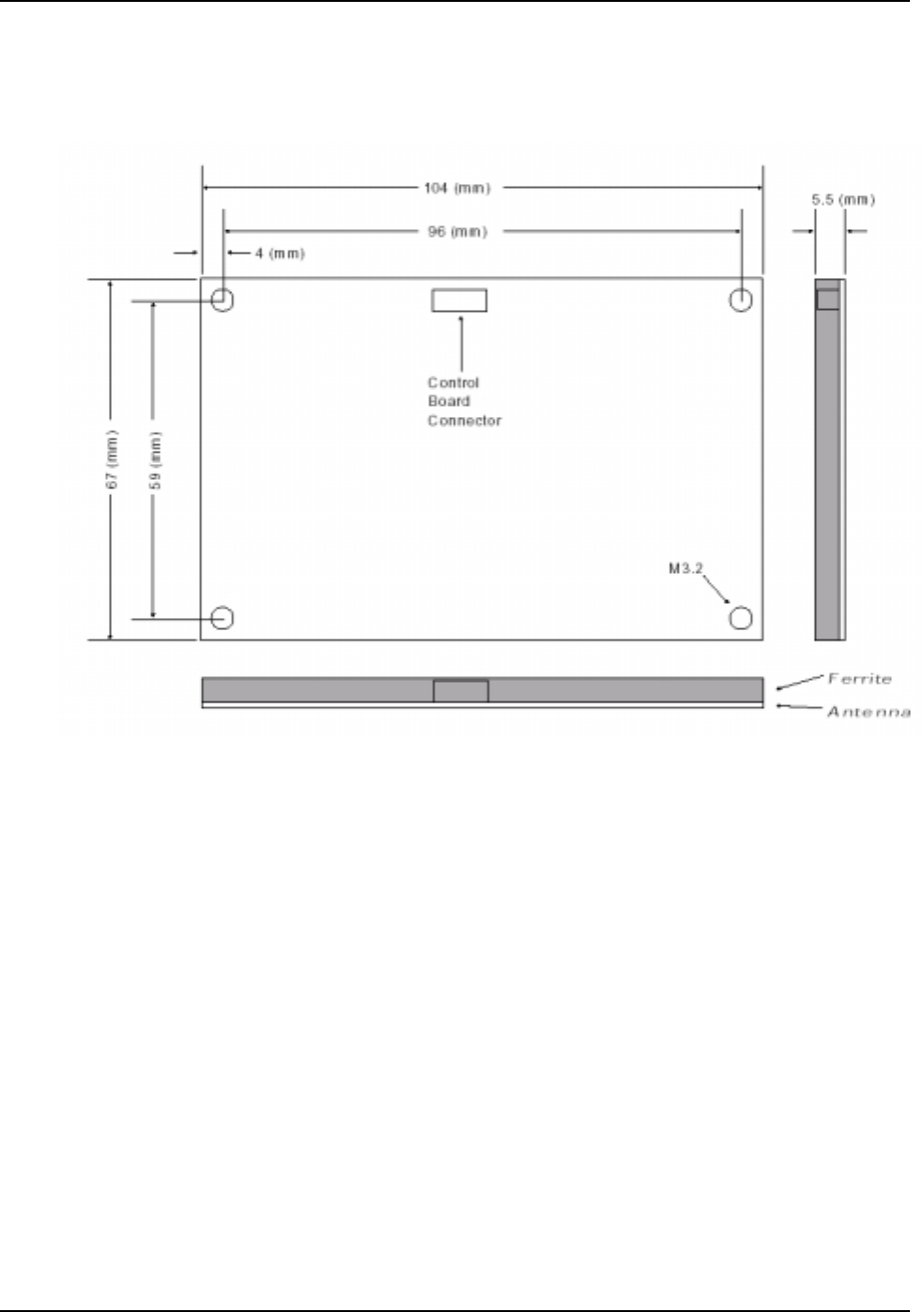 The Control Board and Antenna have the following dimensions: