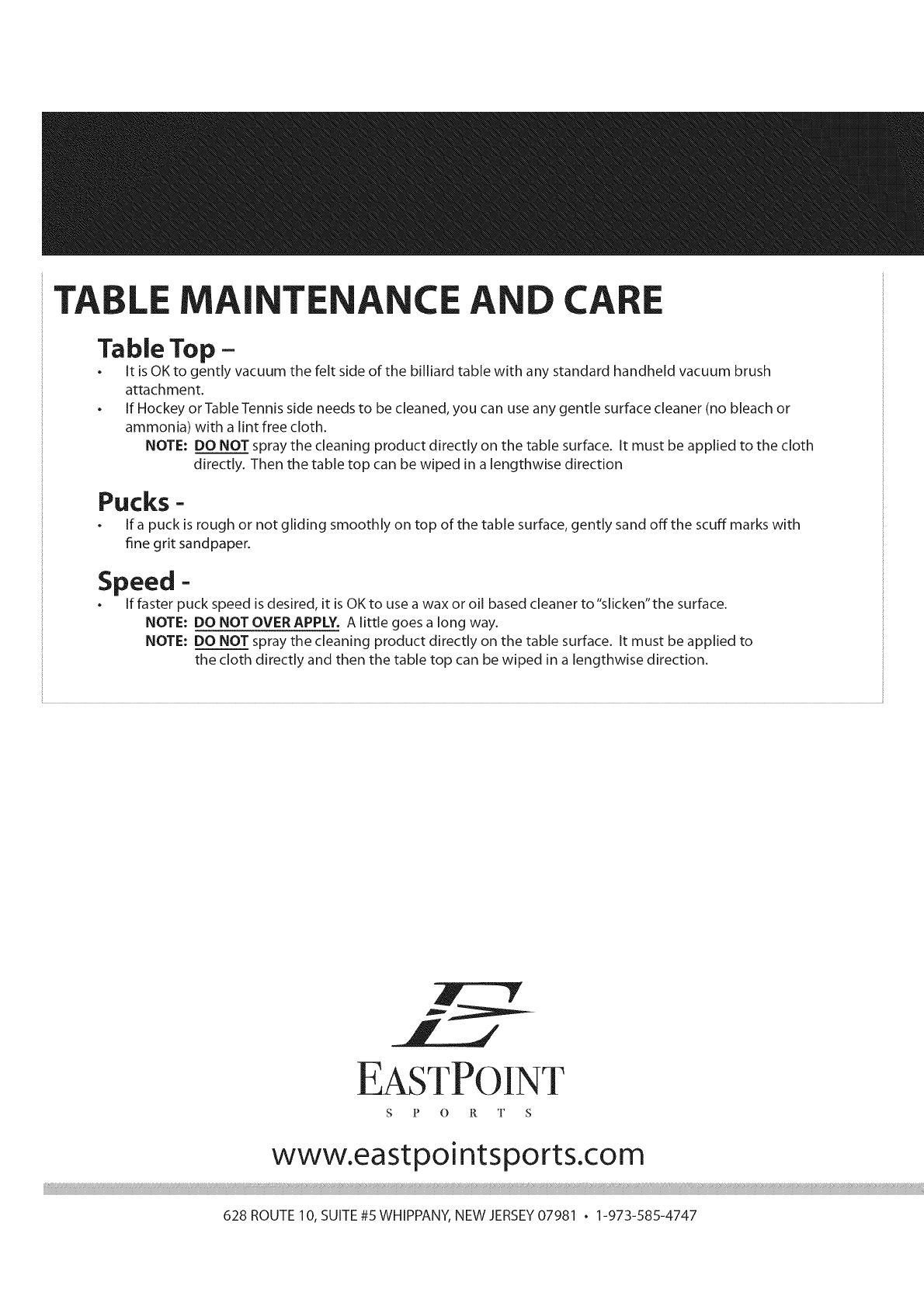 Eastpoint Sports 1 37001 User Manual GAME TABLE Manuals And Guides 1103467L