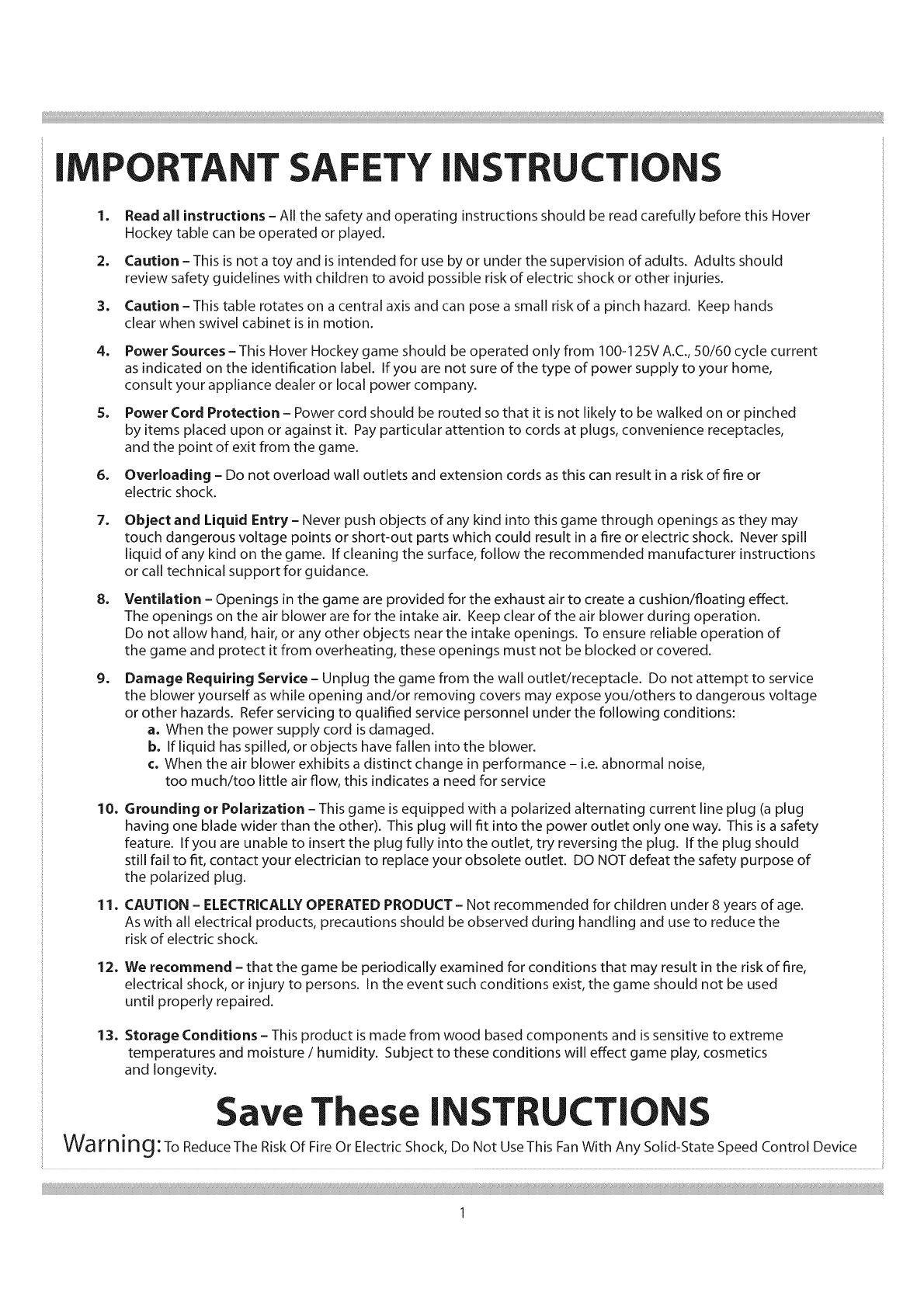 Power Sources -This Hover Hockey game should be operated only from 100-12SV A.C., 50/60 cycle current