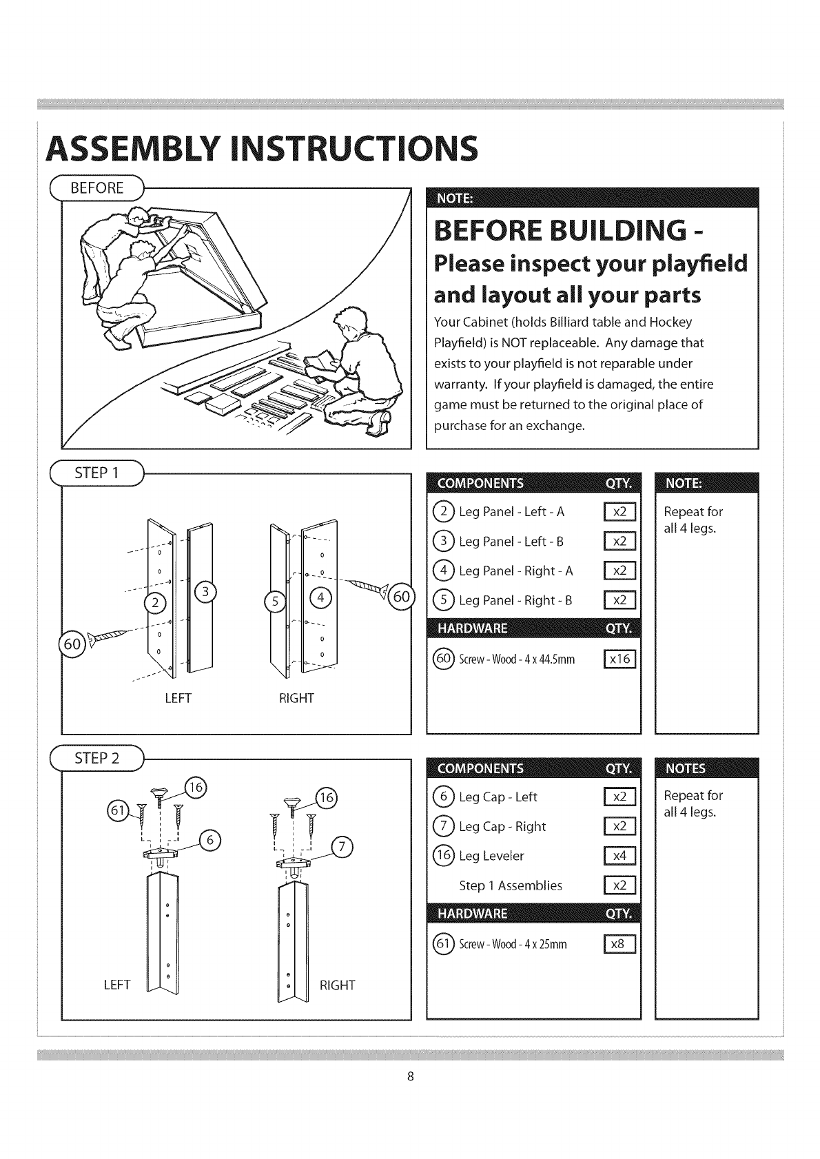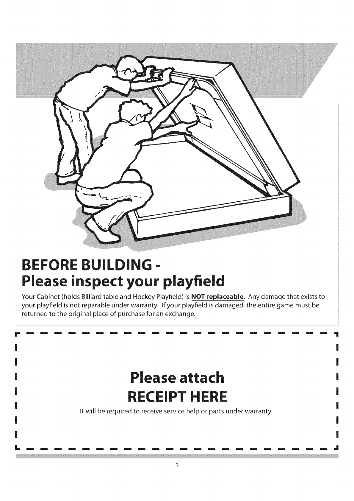 Your Cabinet (holds Billiard table and Hockey Playfield) is NOT replaceable. Any damage that exists to