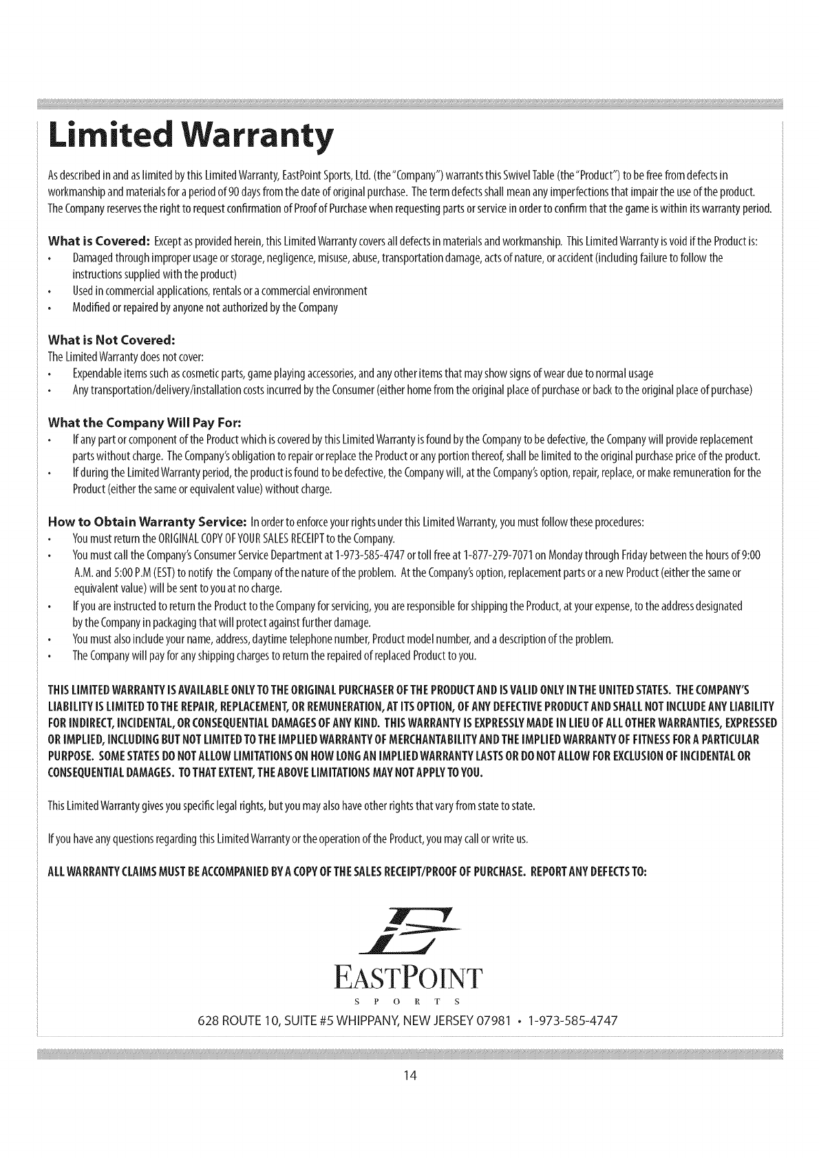 Asdescribedin andaslimitedbythis LimitedWarranty,EastPointSports,Ltd.(the"Company")warrantsthisSwivelTable(the"Product")to befreefromdefectsin